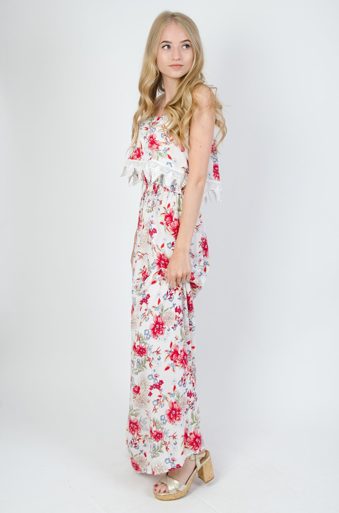 Biała sukienka hiszpanka w kwiaty- guma w pasie