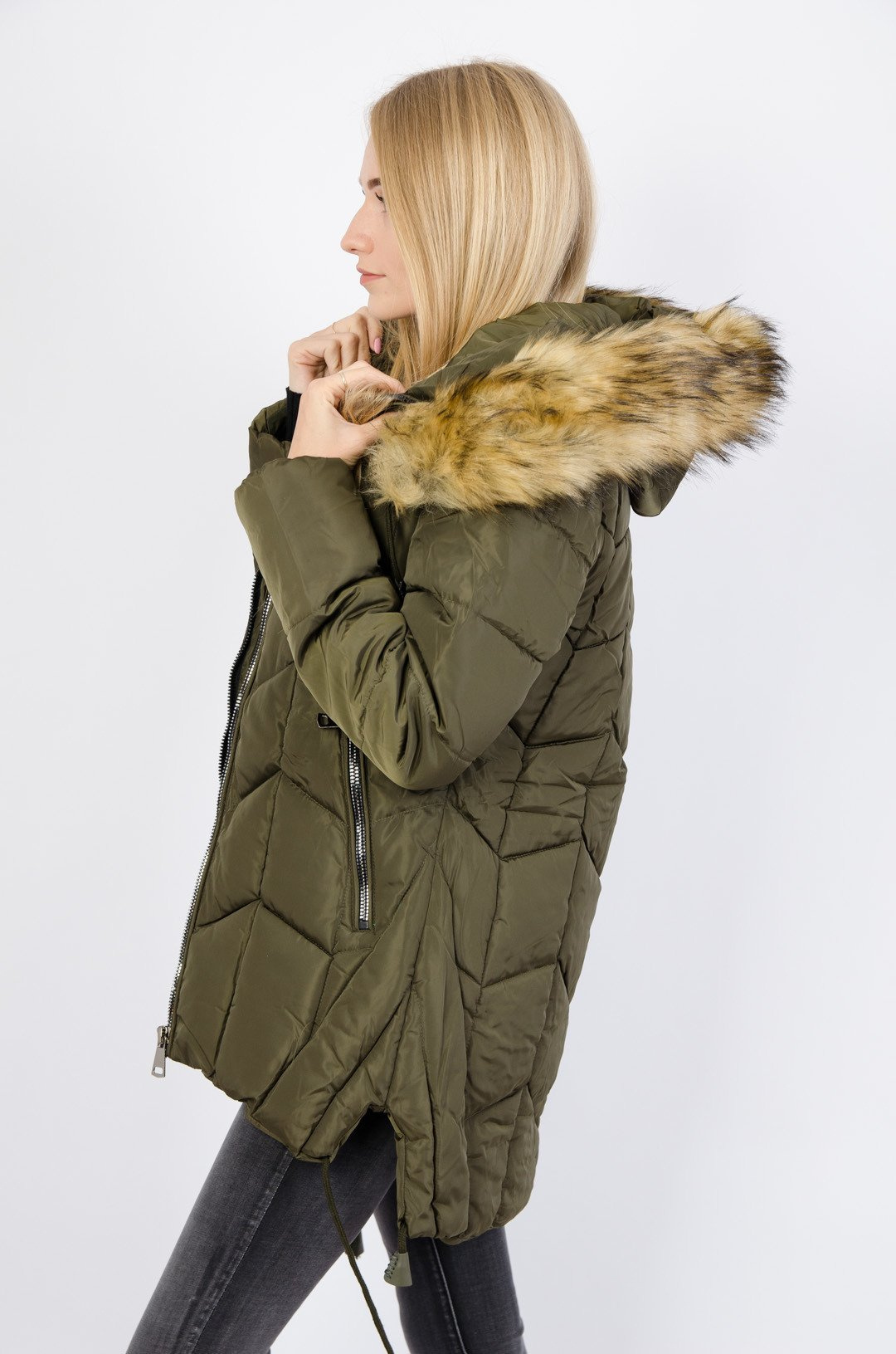 Zielona pikowana kurtka wiązana po bokach.