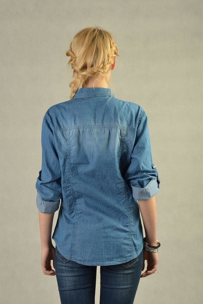 Koszula jeansowa, zapinana na ozdobne guziki, na kołnierzyku złote blaszki. Idealna do wielu codziennych stylizacji.