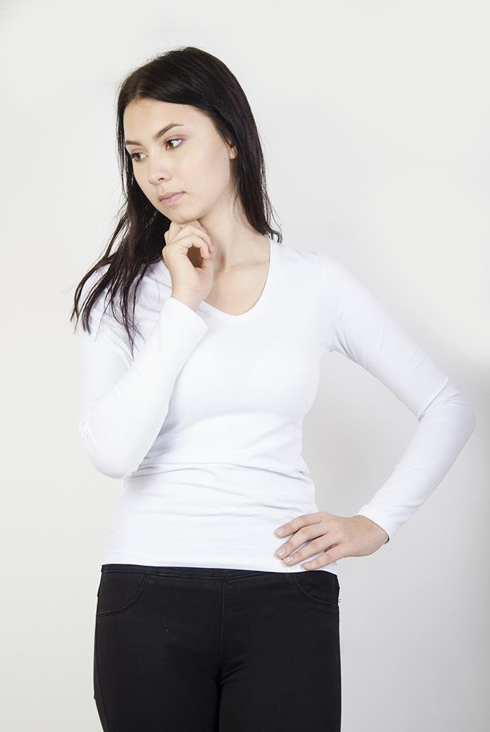 Klasyczna, gładka bluzka z długim rękawem oraz dekoltem w serek. Idealnie sprawdzi się jako baza wielu codziennych stylizacji.