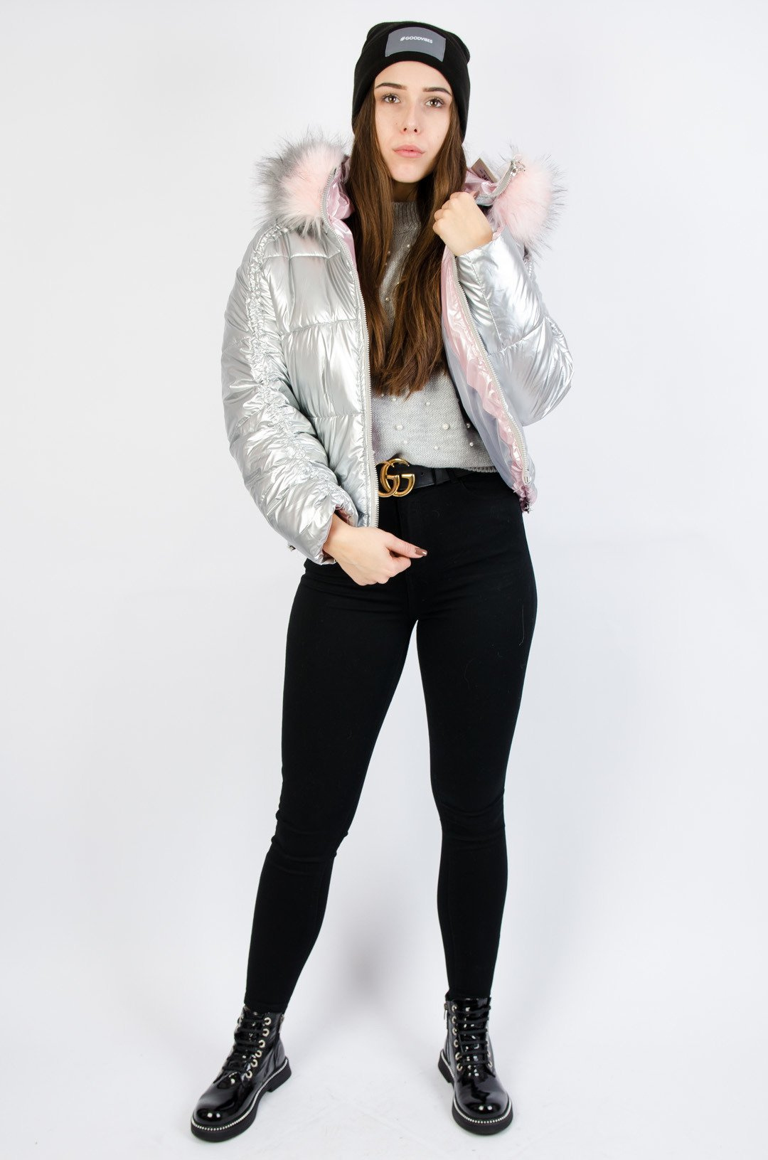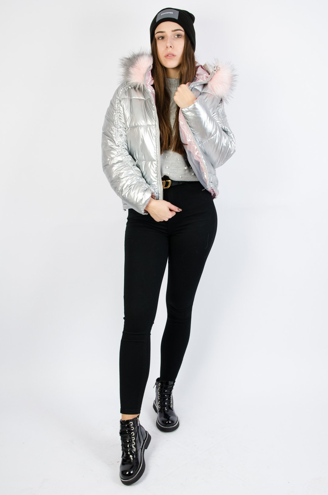 Srebrna metaliczna bomberka z dwukolorowym futerkiem.