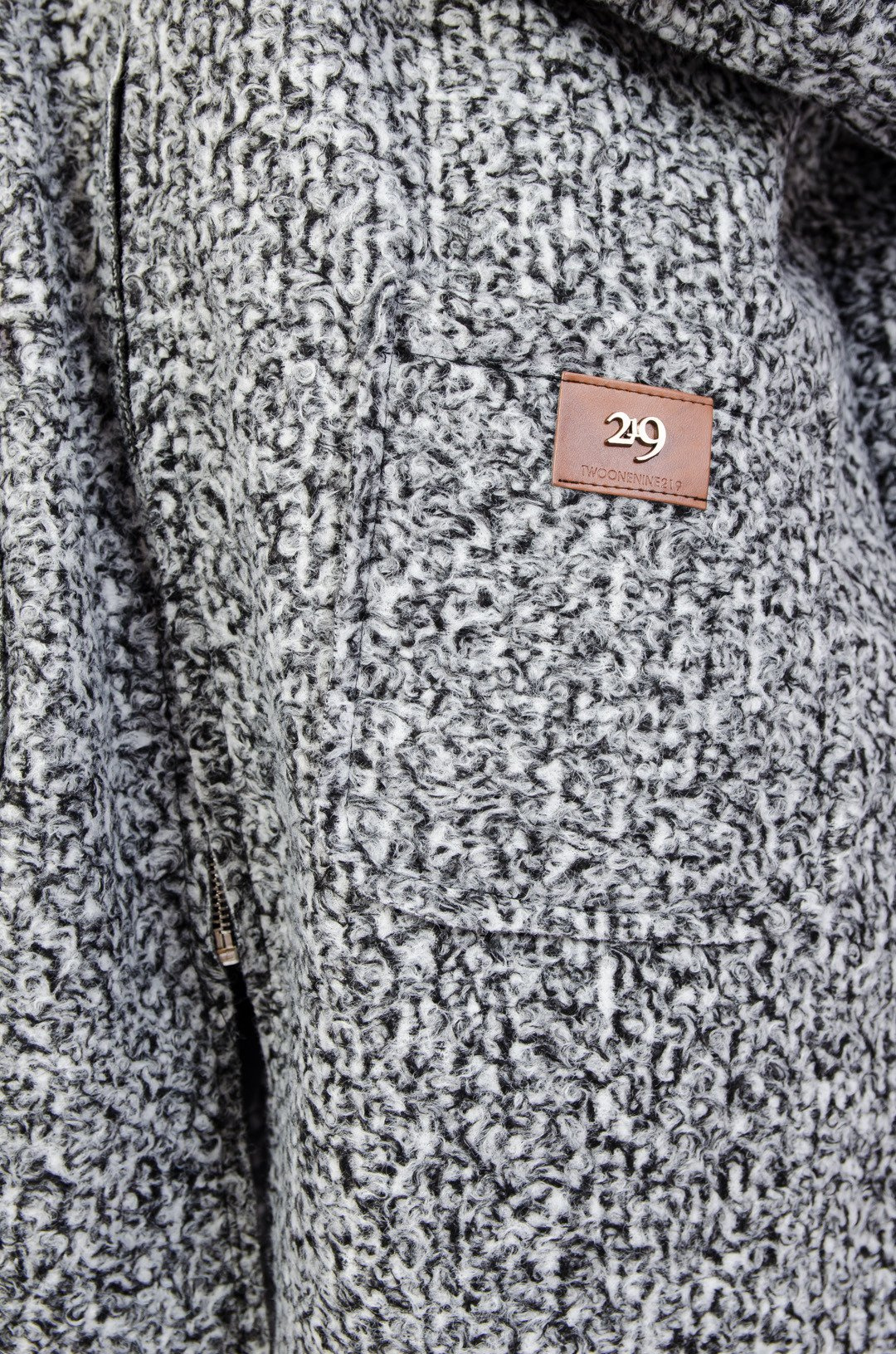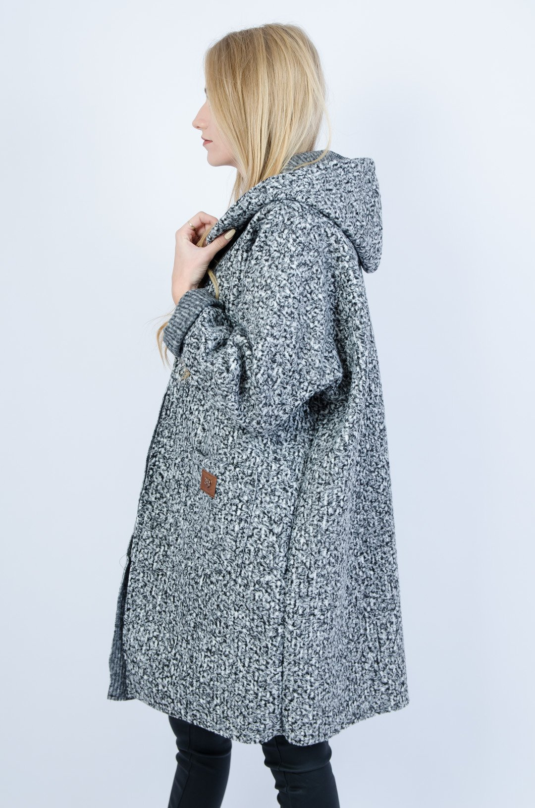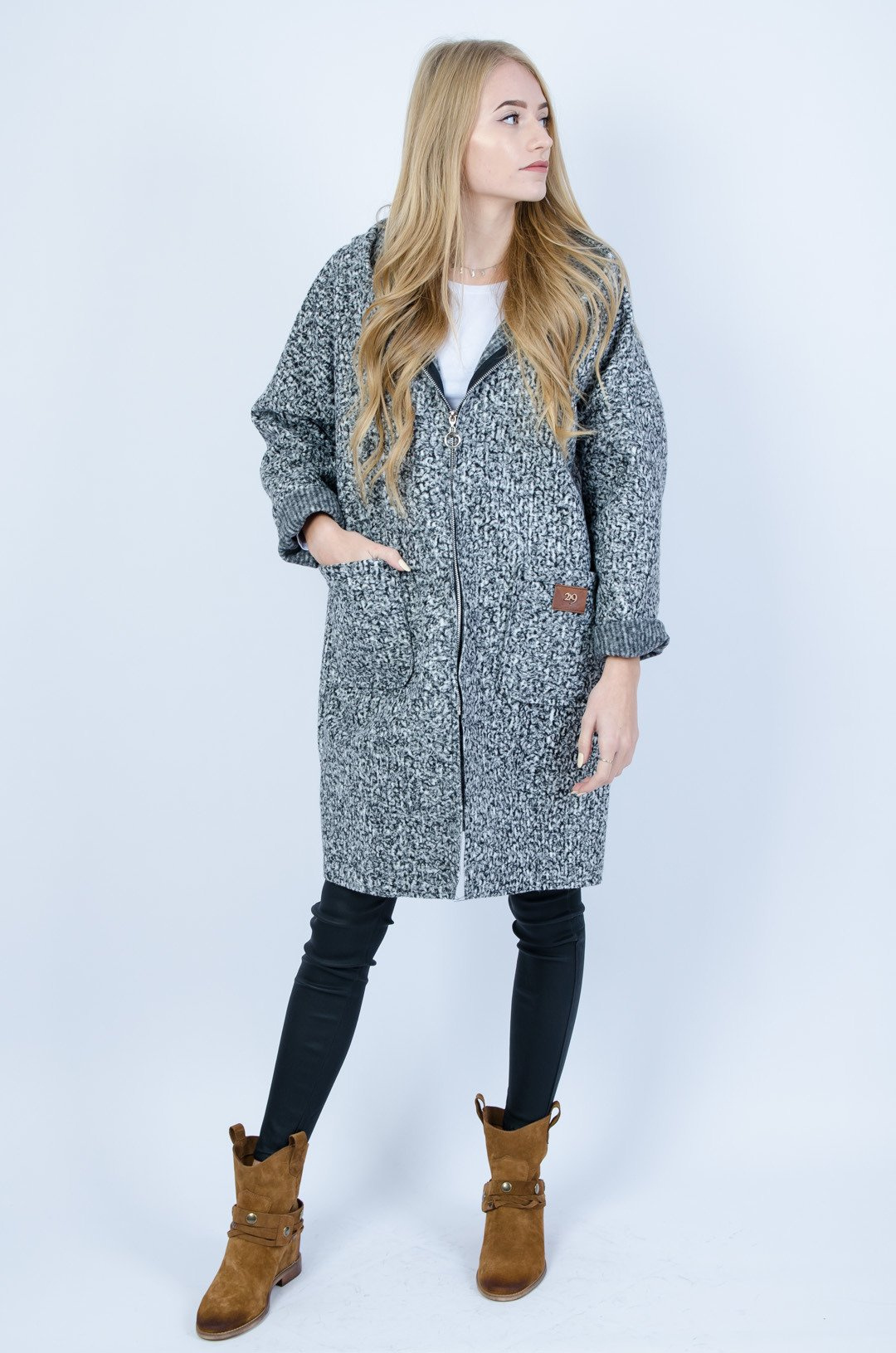 Szary jesienny płaszcz z kapturem oraz naszywką na kieszeni