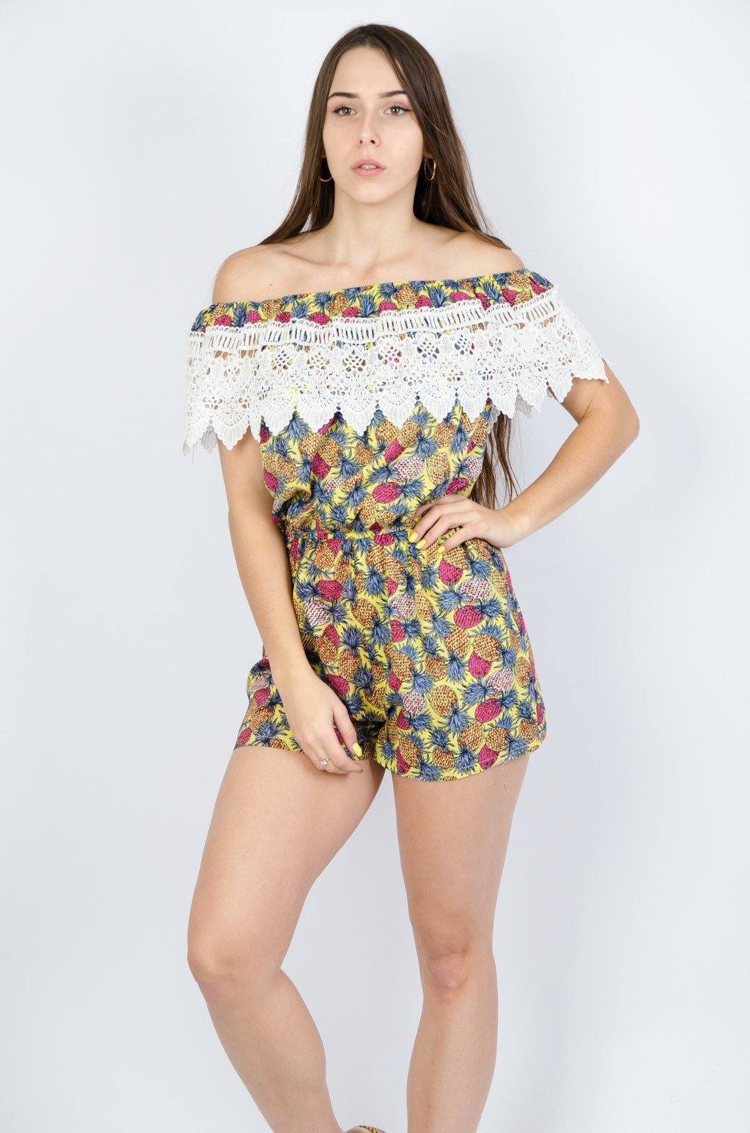 Żółty kombinezon w ananasy wykończony koronką