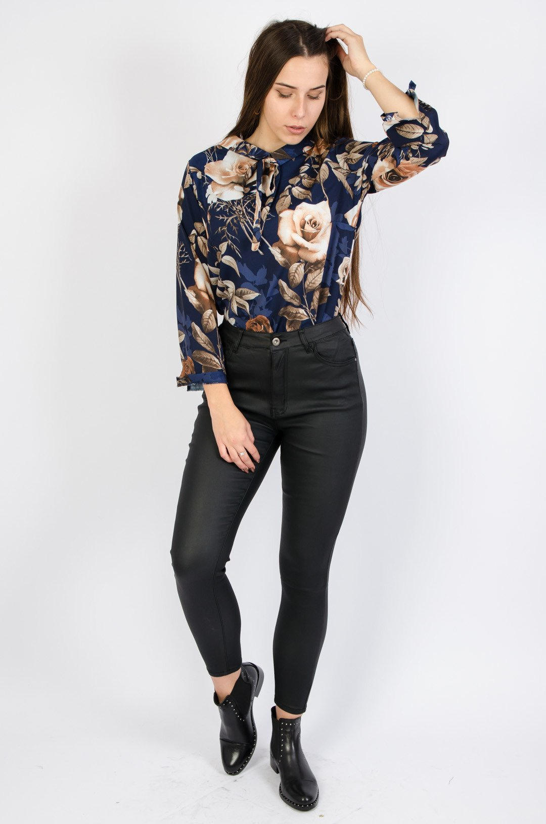 Granatowa bluzka z długim rękawem w kwiaty