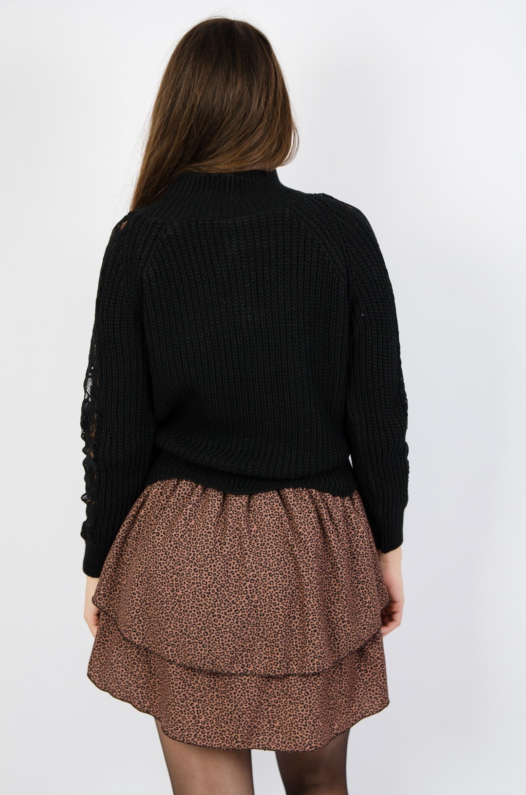 Czarny sweter z półgolfem oraz koronką na rękawach
