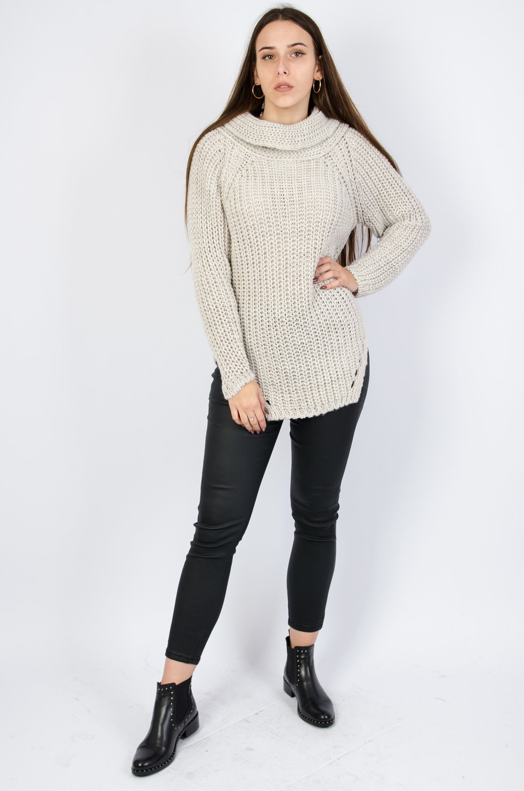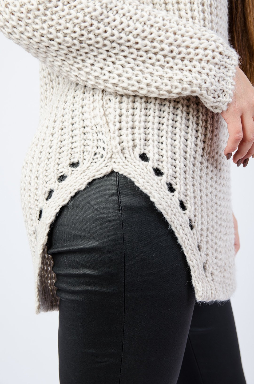 Beżowy sweter z golfem oraz asymetrycznym dołem