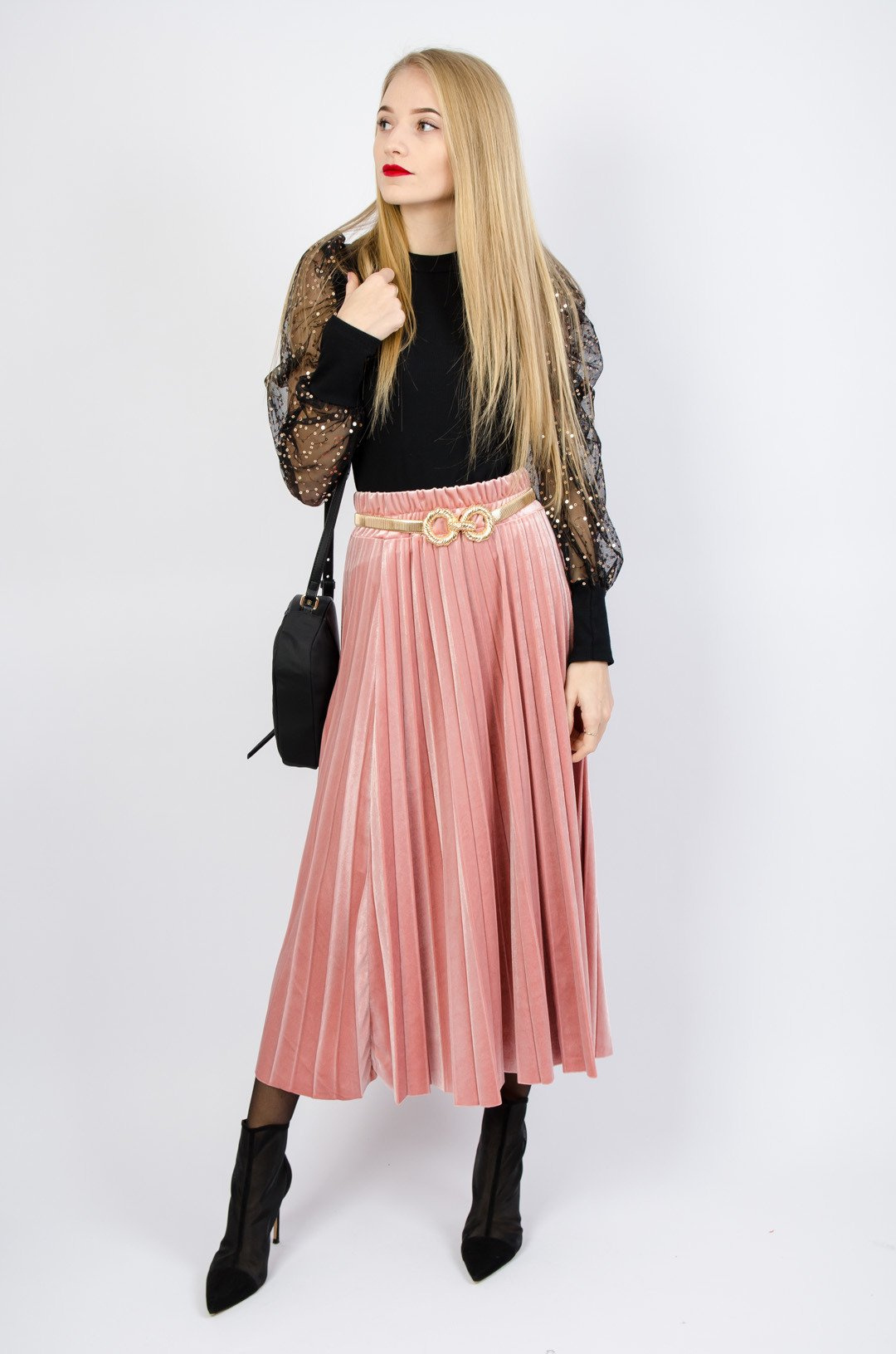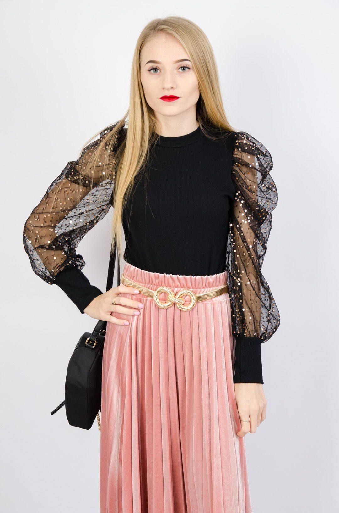 Czarna bluzka z bufkami oraz złotymi cekinami