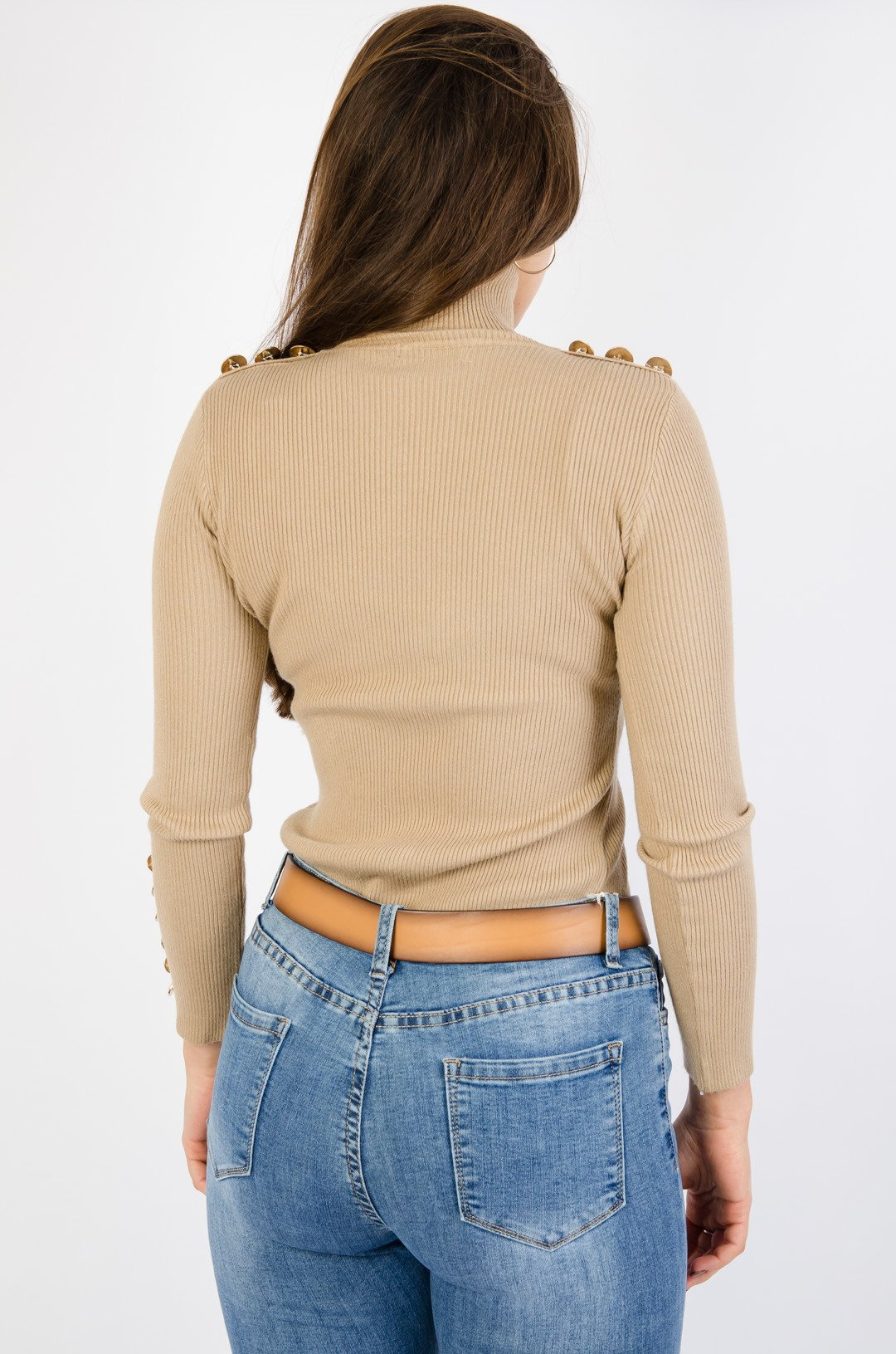 Beżowy prążkowany golf ze złotymi guzikami