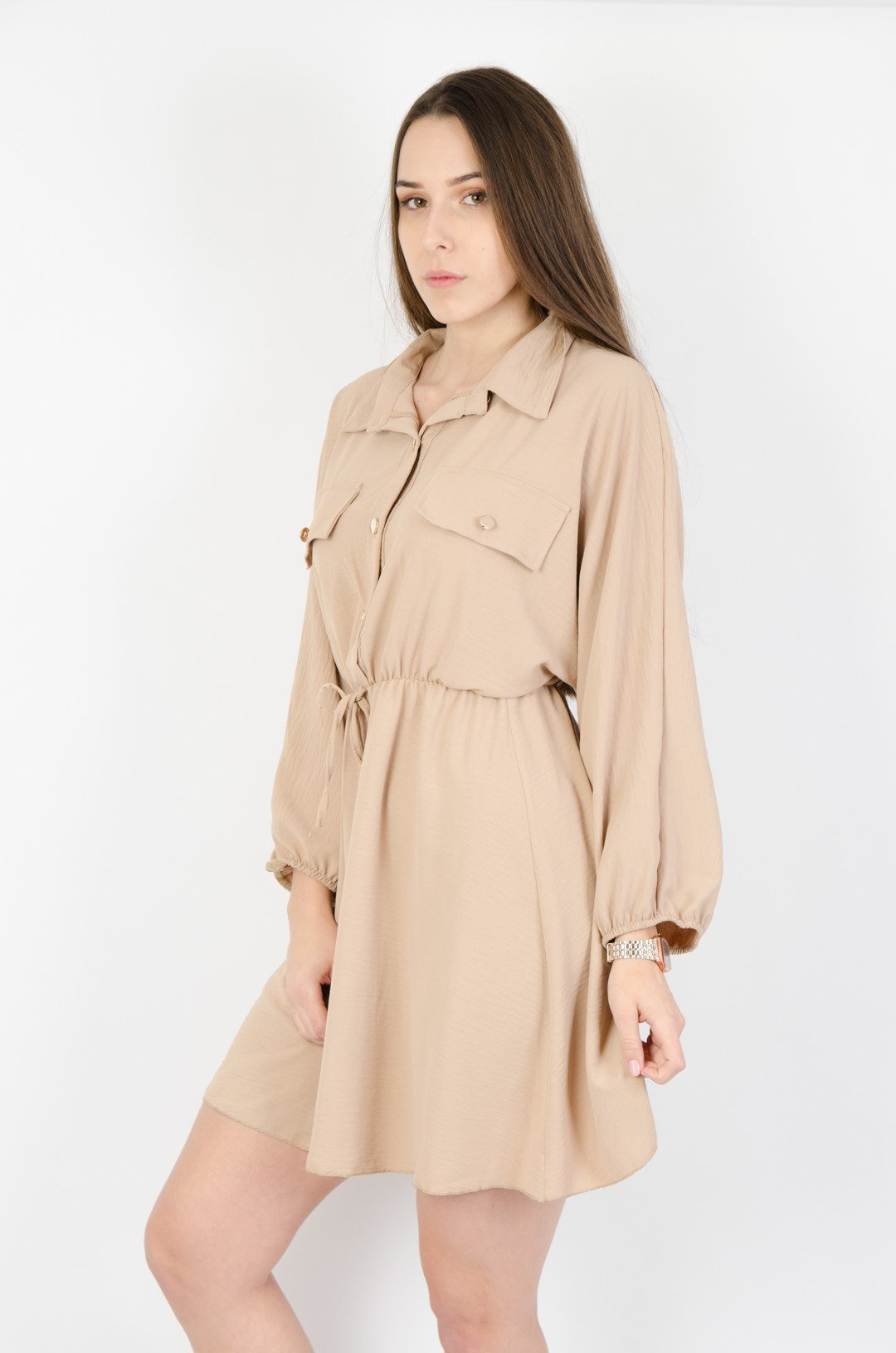 BEŻOWA SUKIENKA Z KREPY ŚCIĄGANA W PASIE