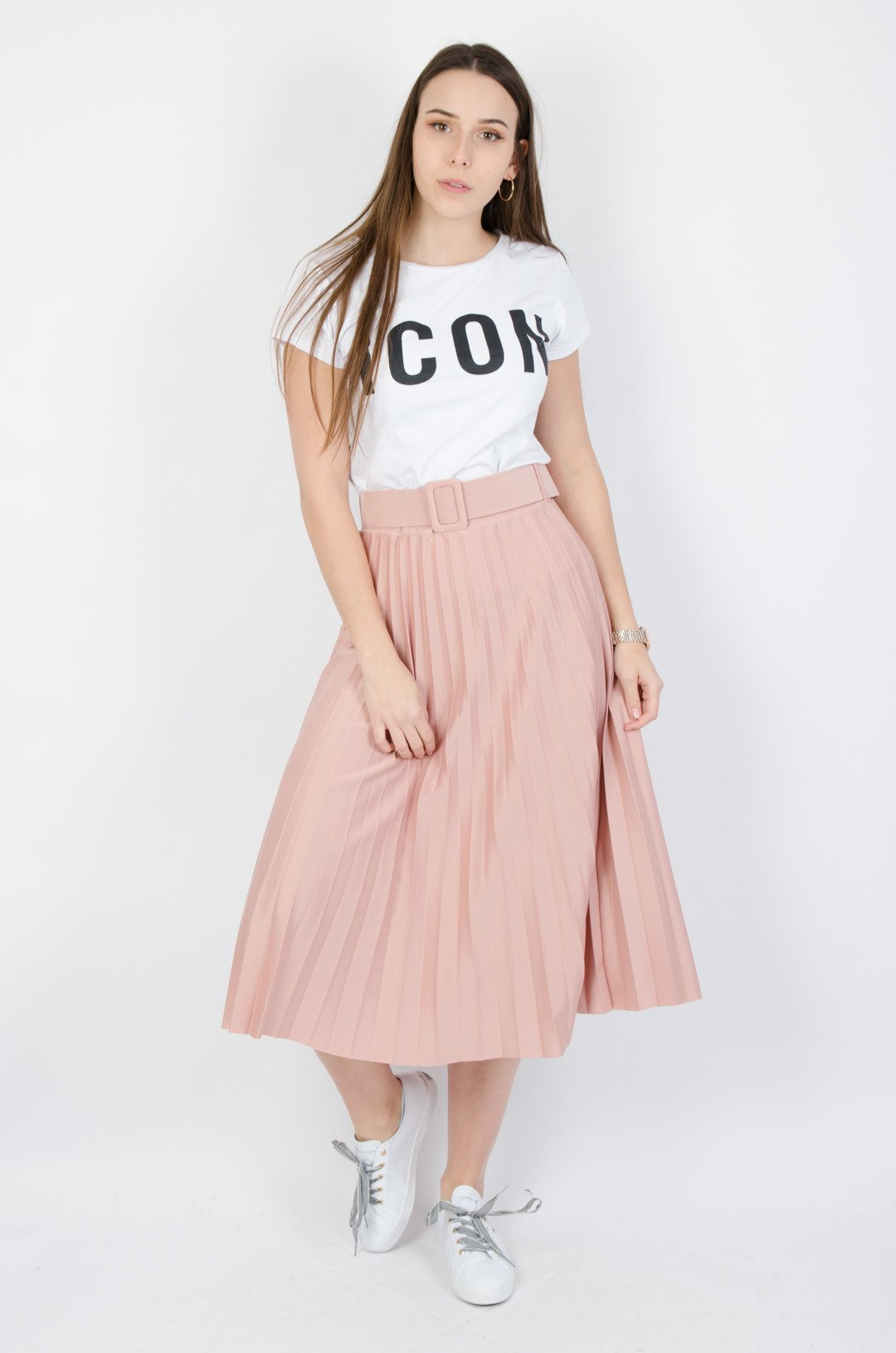 Różowa plisowana spódnica midi z paskiem