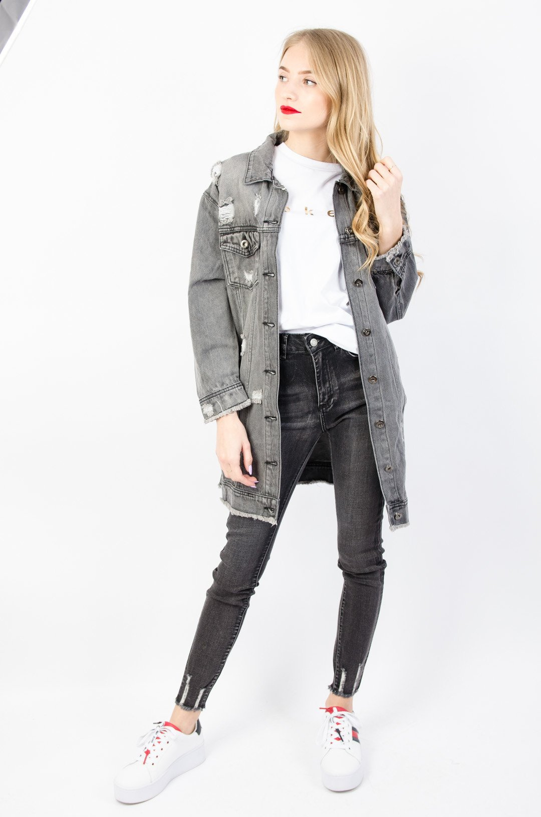 SZARA DŁUGA KURTKA JEANSOWA Z PRZETARCIAMI
