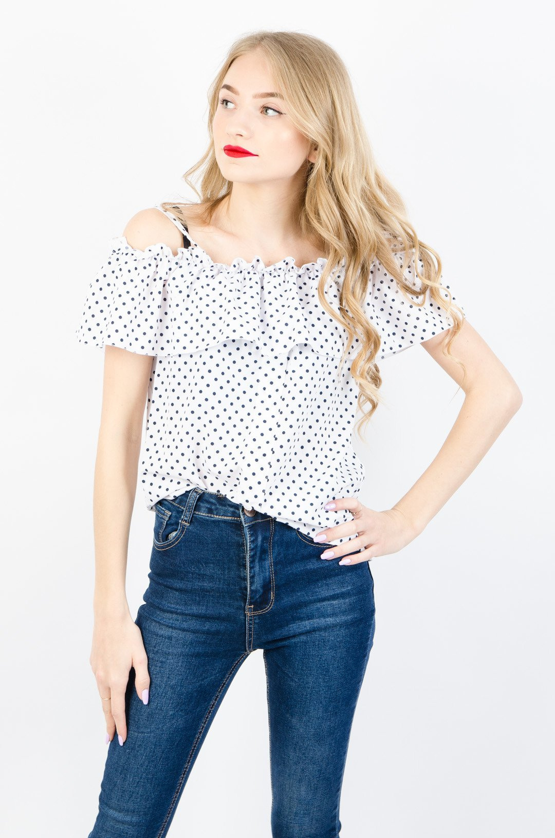 Biała bluzka w groszki z hiszpańskim dekoltem