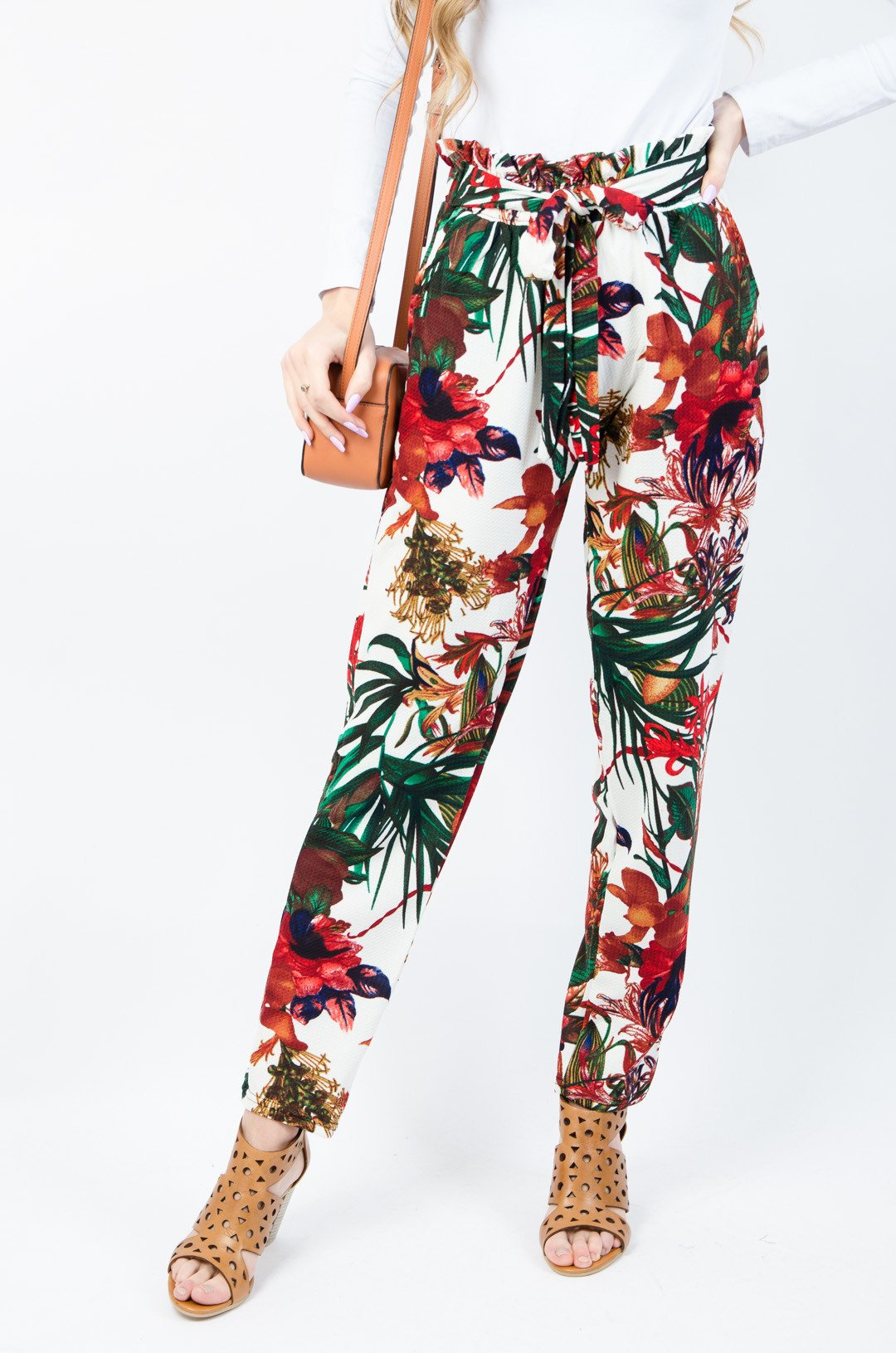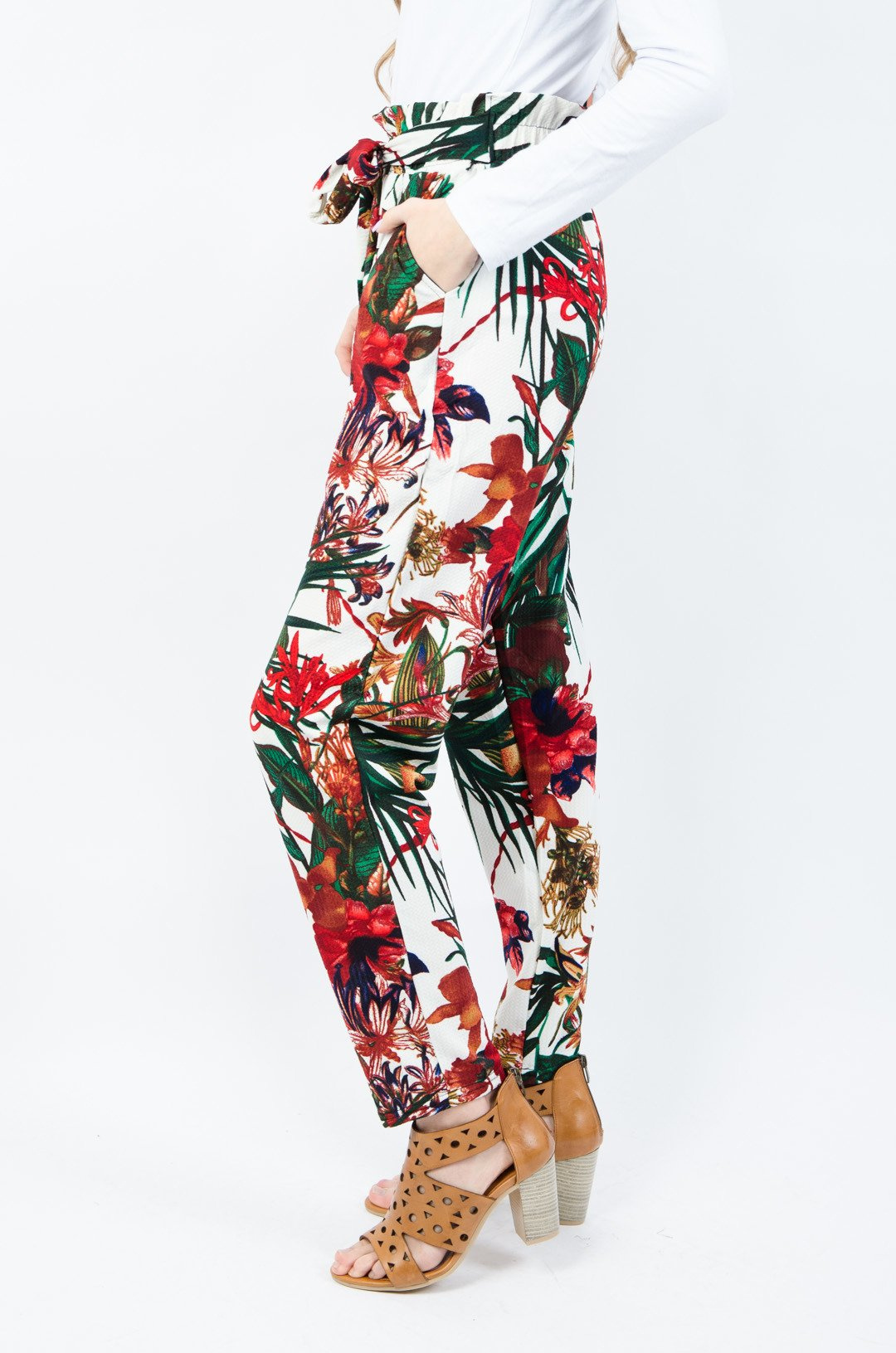 Białe alladynki w kwiaty z wiązaniem w pasie.
