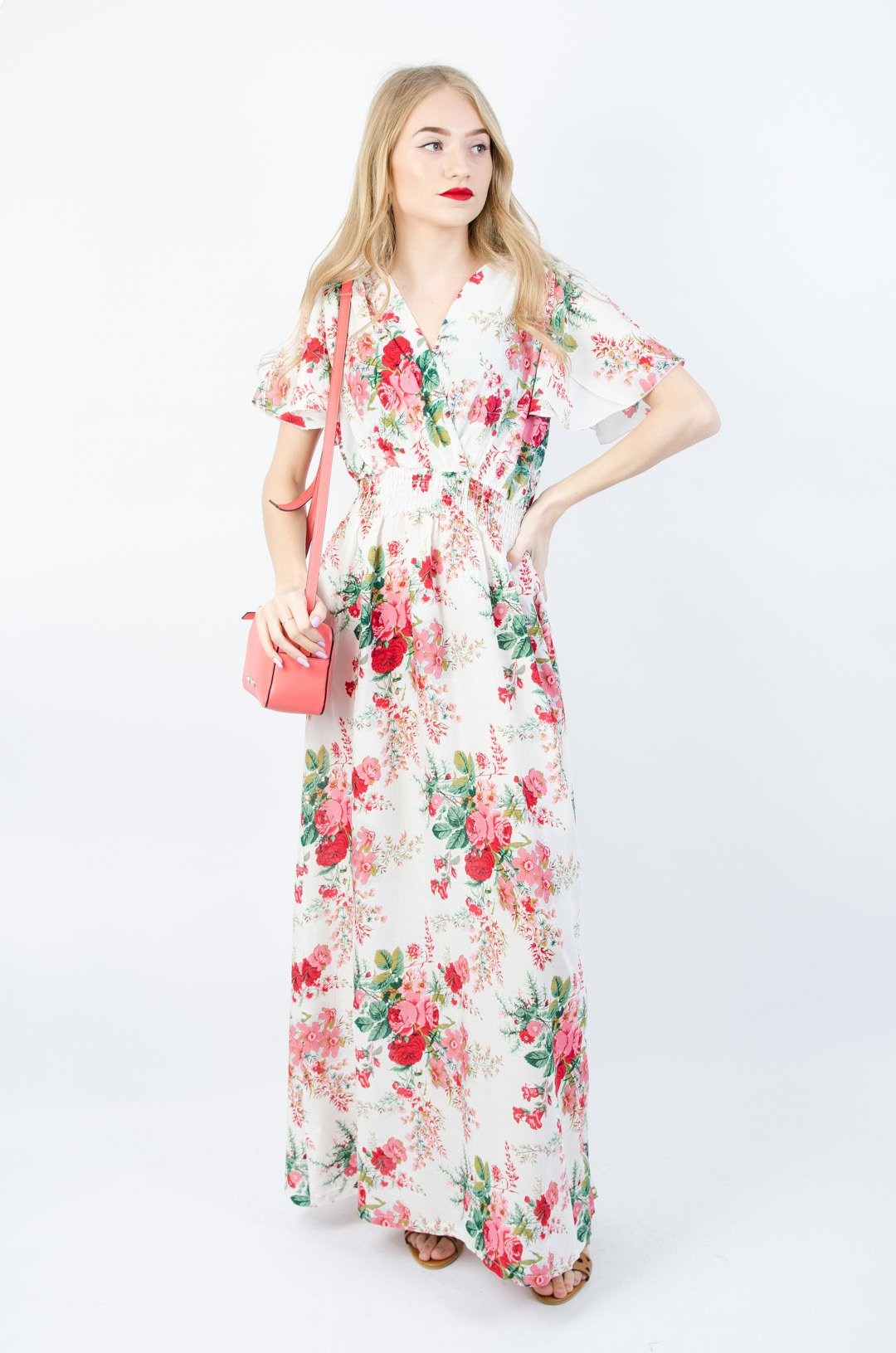 Biała długa sukienka w kwiaty z gumą w pasie