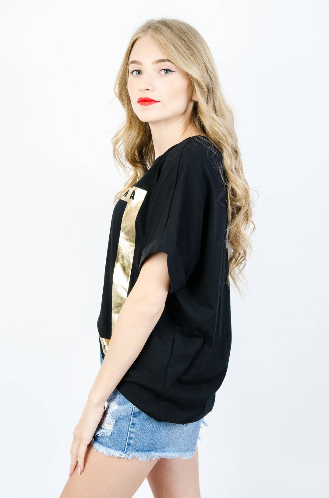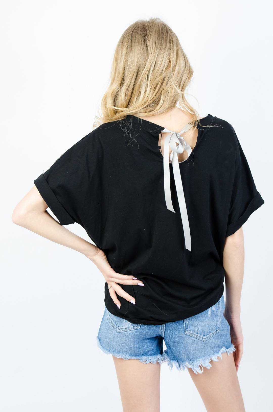 CZARNY BAWEŁNIANY T-SHIRT ZE ZŁOTYM NADRUKIEM ORAZ WIĄZANIEM NA PLECACH