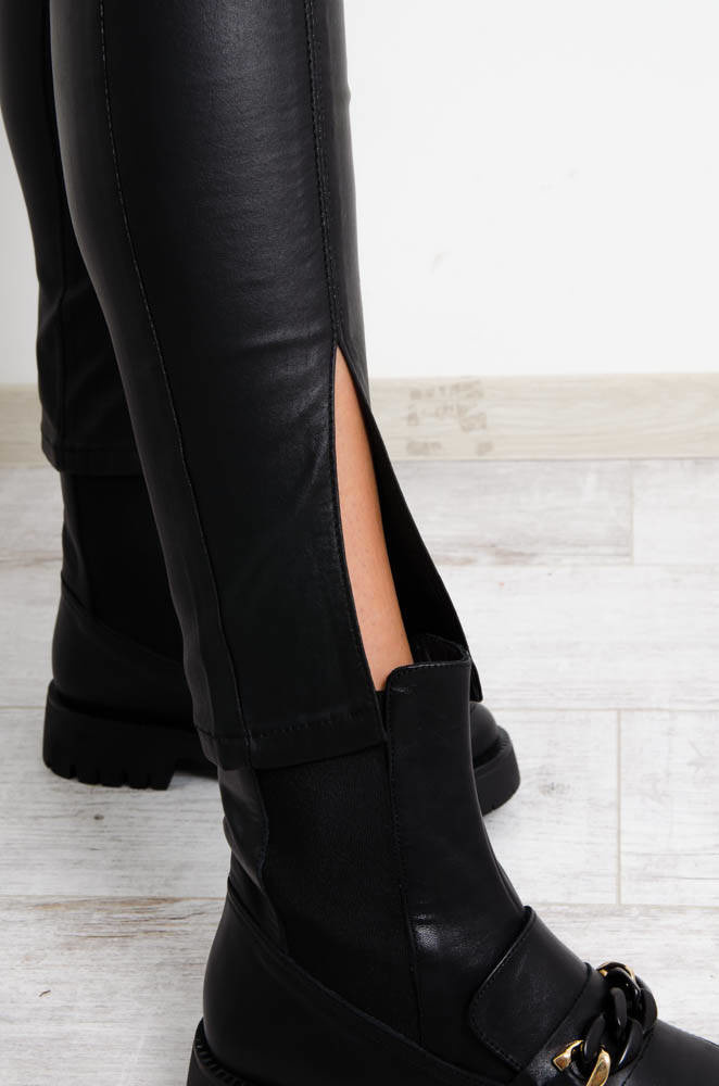 CZARNE SPODNIE WOSKOWANE Z PRZESZYCIAMI NA NOGAWKACH - IMITACJA SKÓRY