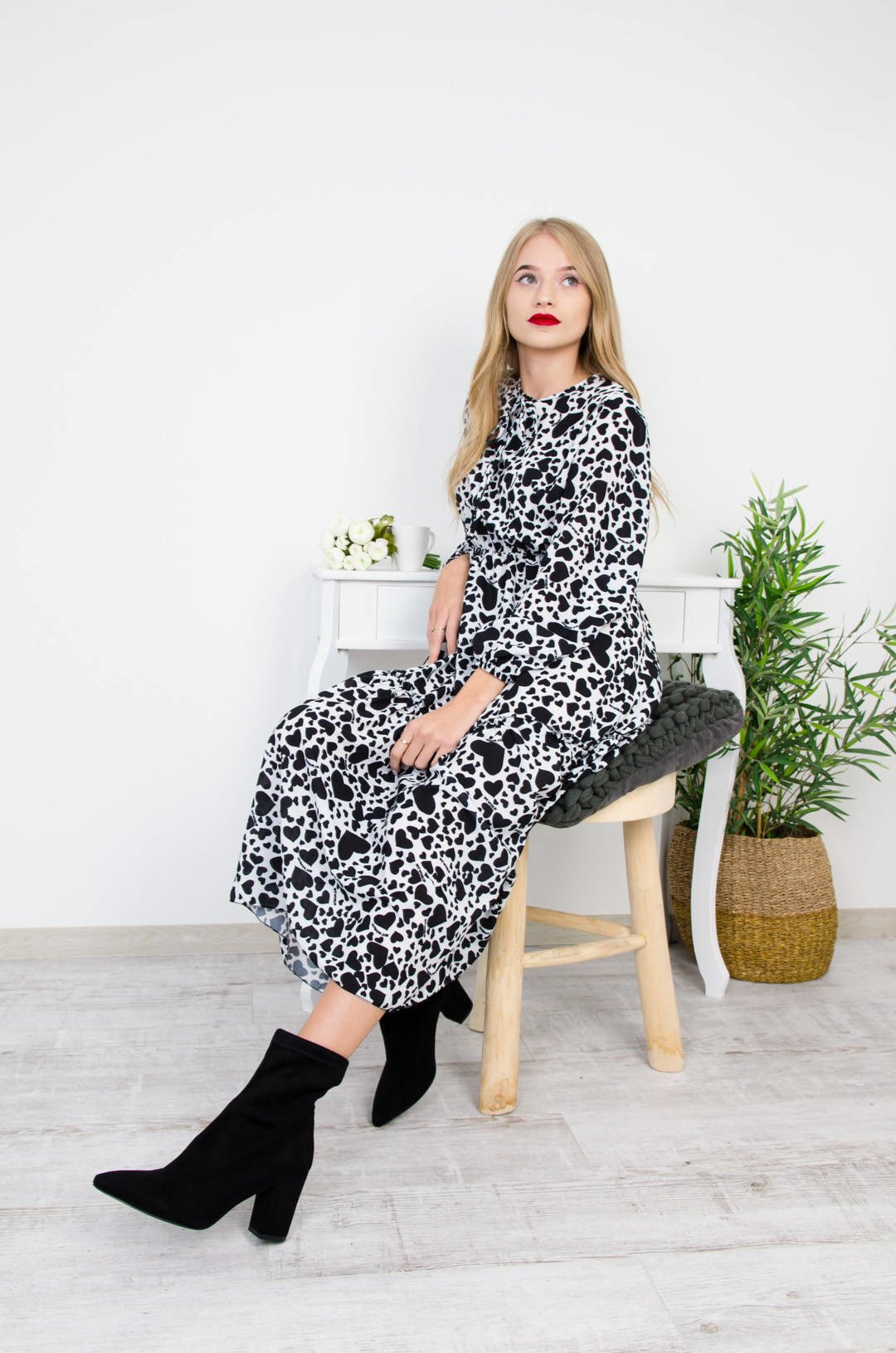 BIAŁA SUKIENKA MIDI W CZARNE SERDUSZKA