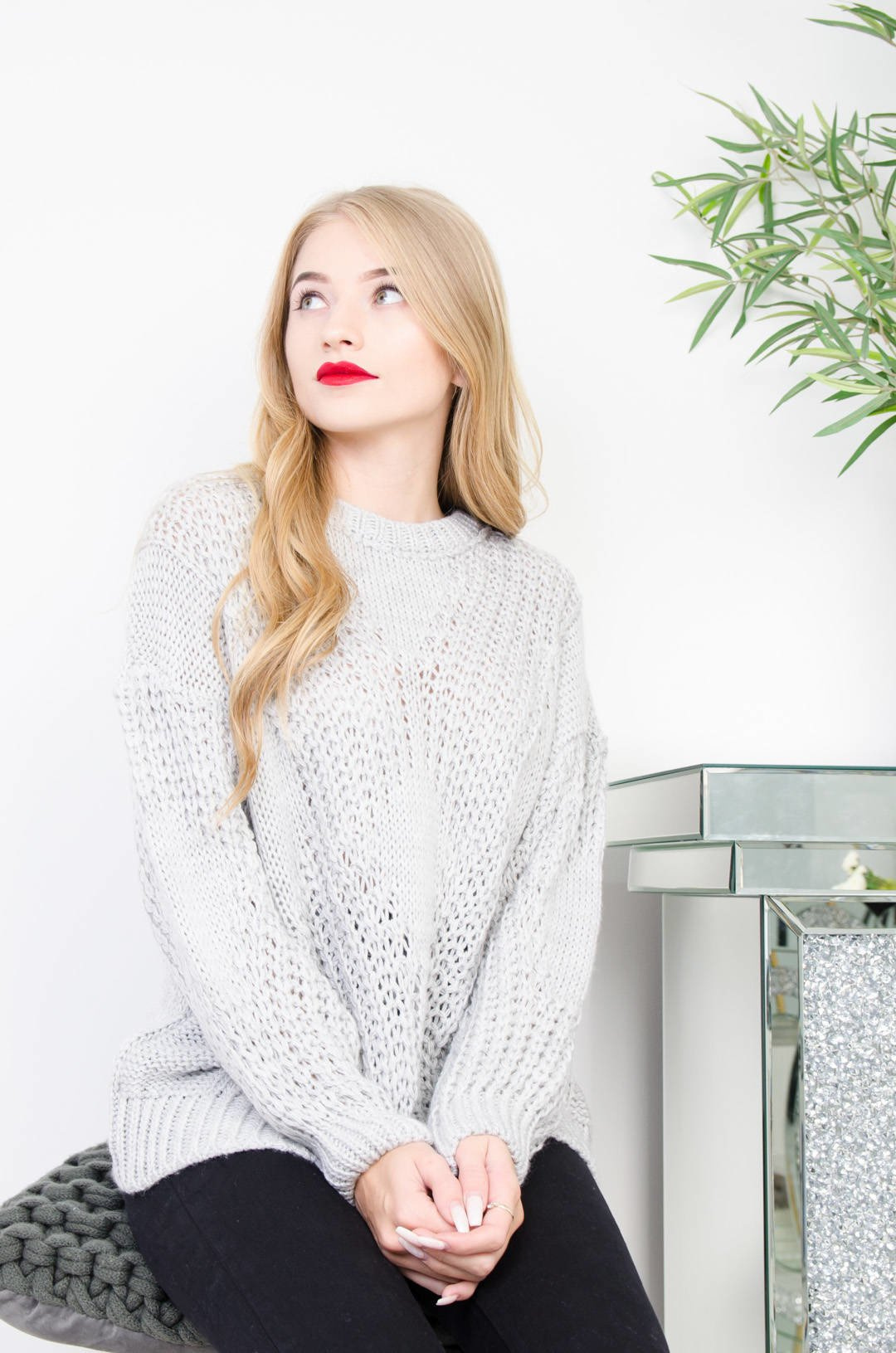 SZARY OVERSIZOWY SWETER Z AŻUROWYMI WSTAWKAMI