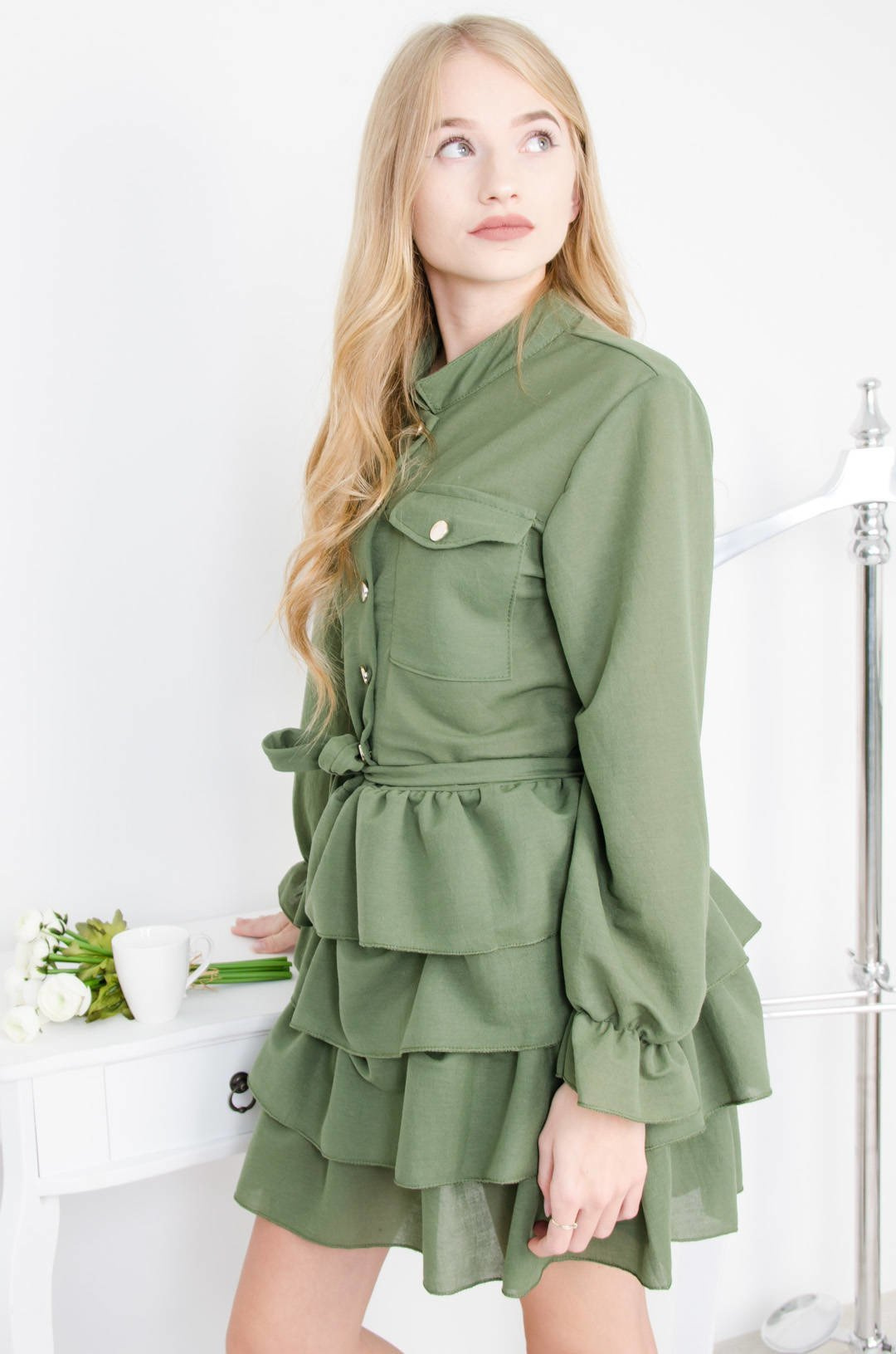 ZIELONA SUKIENKA KOSZULOWA Z FALBANAMI