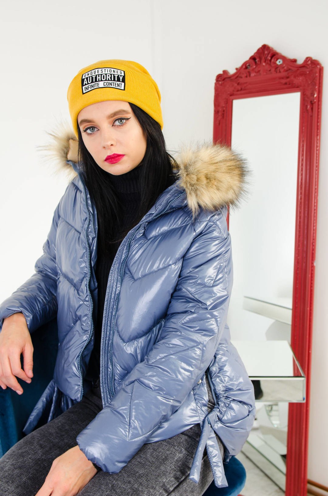 GRANATOWA  ASYMETRYCZNA PIKOWANA KURTKA Z KAPTUREM