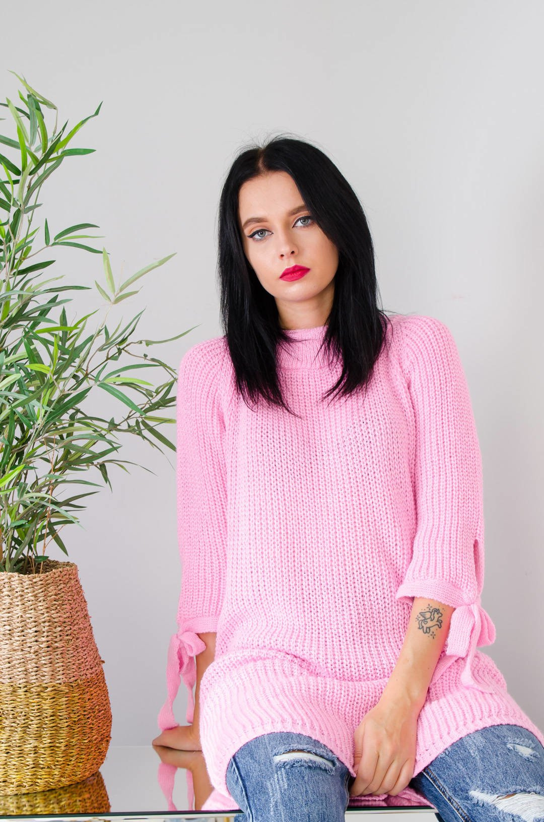 DŁUGI RÓŻOWY SWETER-SUKIENKA Z WIĄZANIEM NA RĘKAWACH
