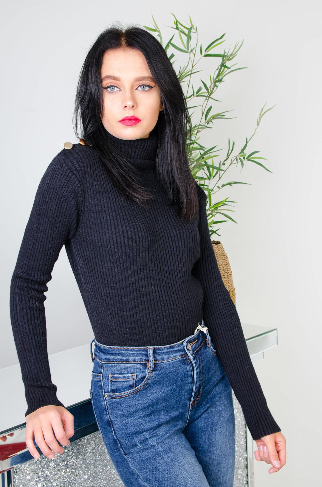 CZARNY PRĄŻKOWANY GOLF ZE ZŁOTYMI GUZIKAMI