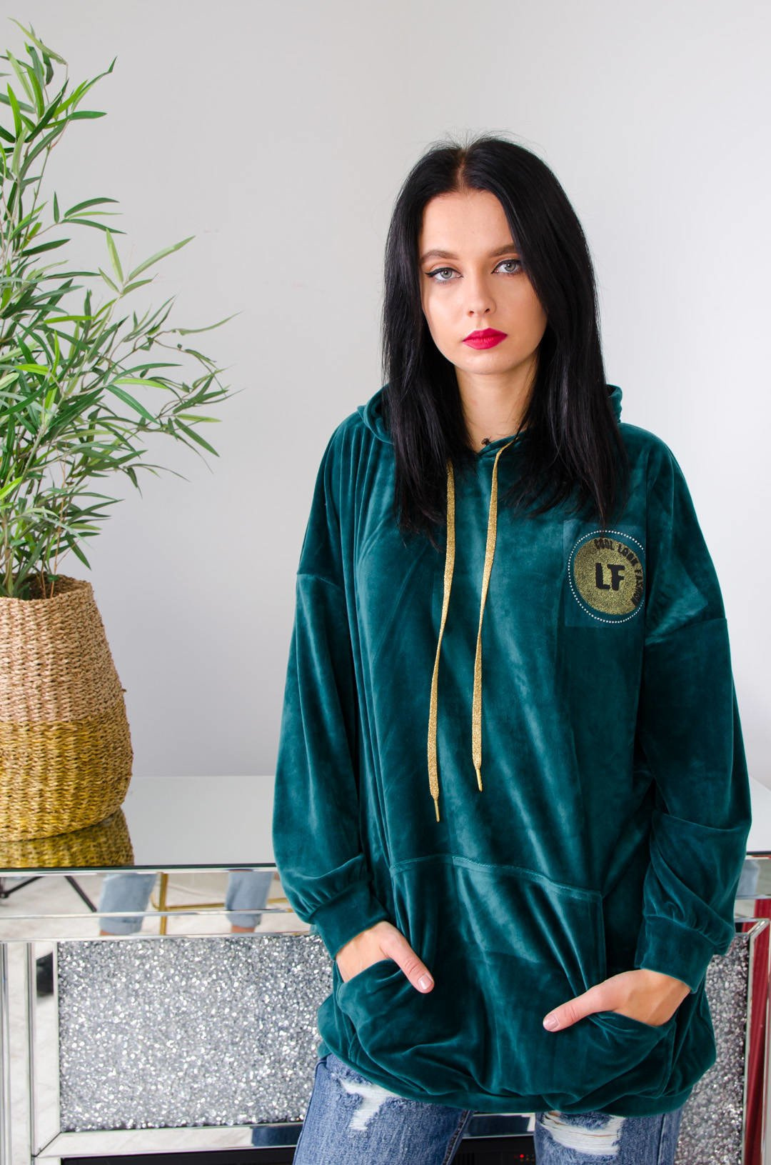 ZIELONA WELUROWA DŁUGA BLUZA Z NASZYWKĄ