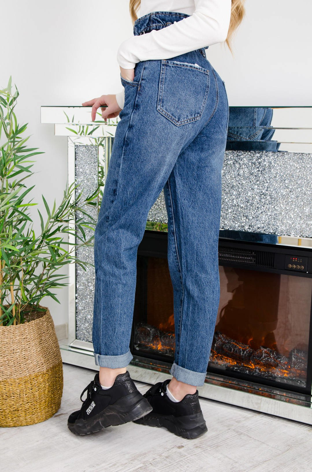 CIEMNE JEANSY MOM FIT Z GUMĄ W PASIE-WYSOKI STAN