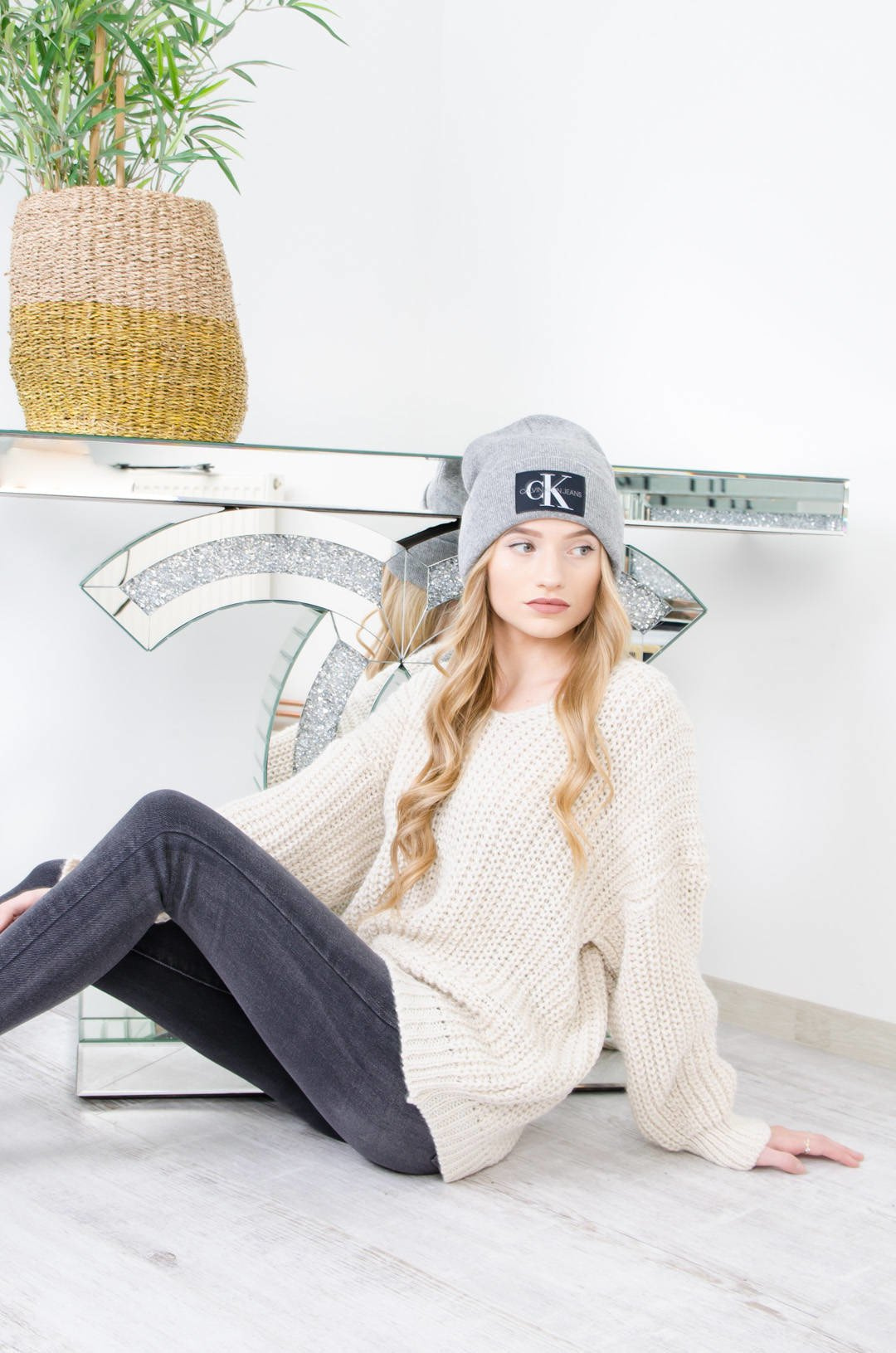 BEŻOWY AKRYLOWY SWETER Z DEKOLTEM W SZPIC