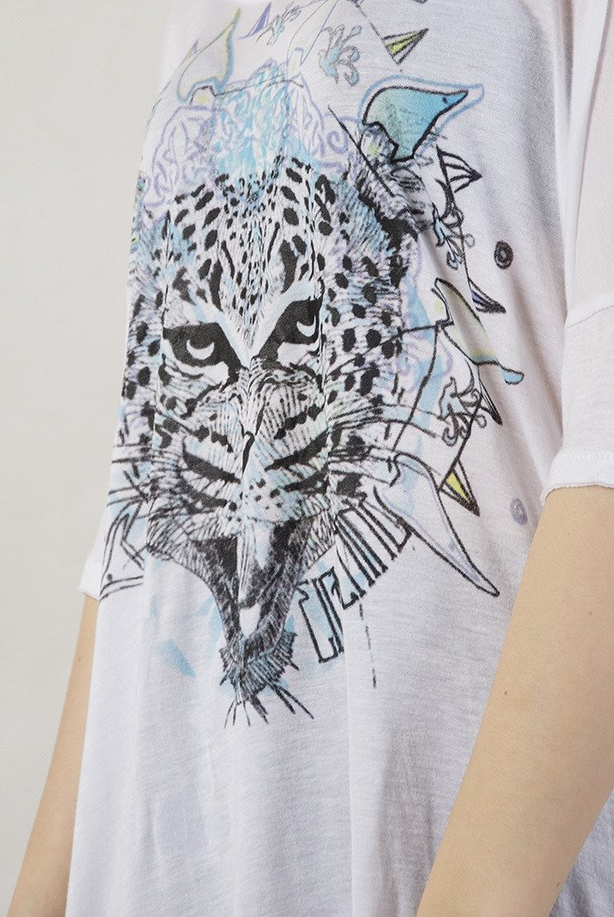 Luźna bluzka, z krótkim rękawkiem. Z przodu nadruk- lampart. Z tyłu na plecach głębokie wycięcie.