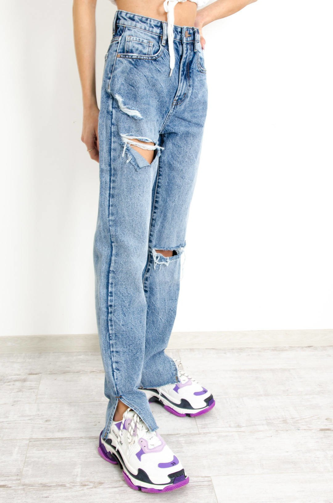 JASNE SPODNIE JEANSOWE MOM FIT Z DZIURAMI - WYSOKI STAN