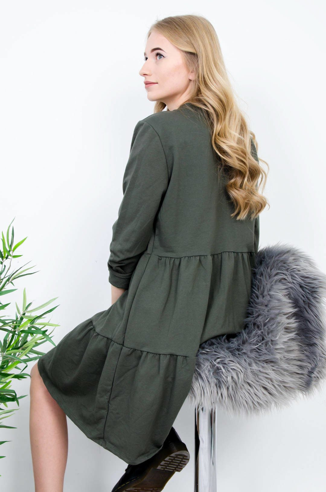 ZIELONA ROZKLOSZOWANA SUKIENKA ZE ZŁOTYM ŁAŃCUSZKIEM