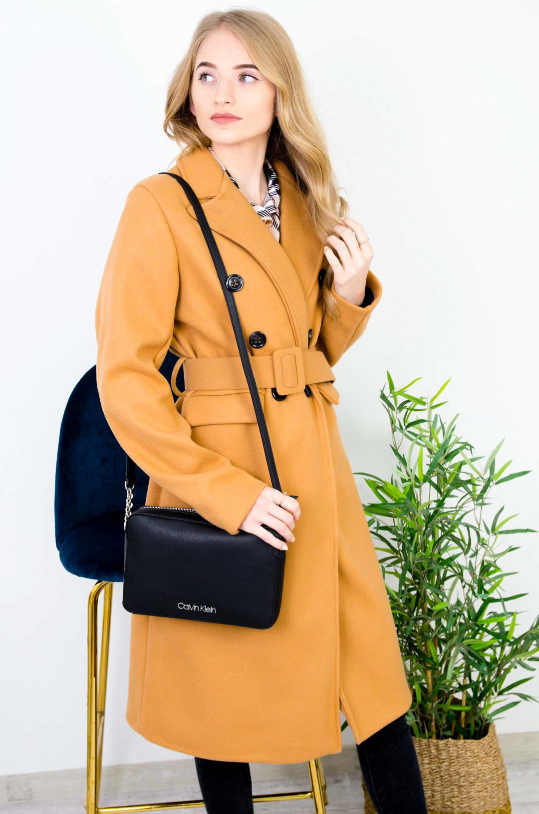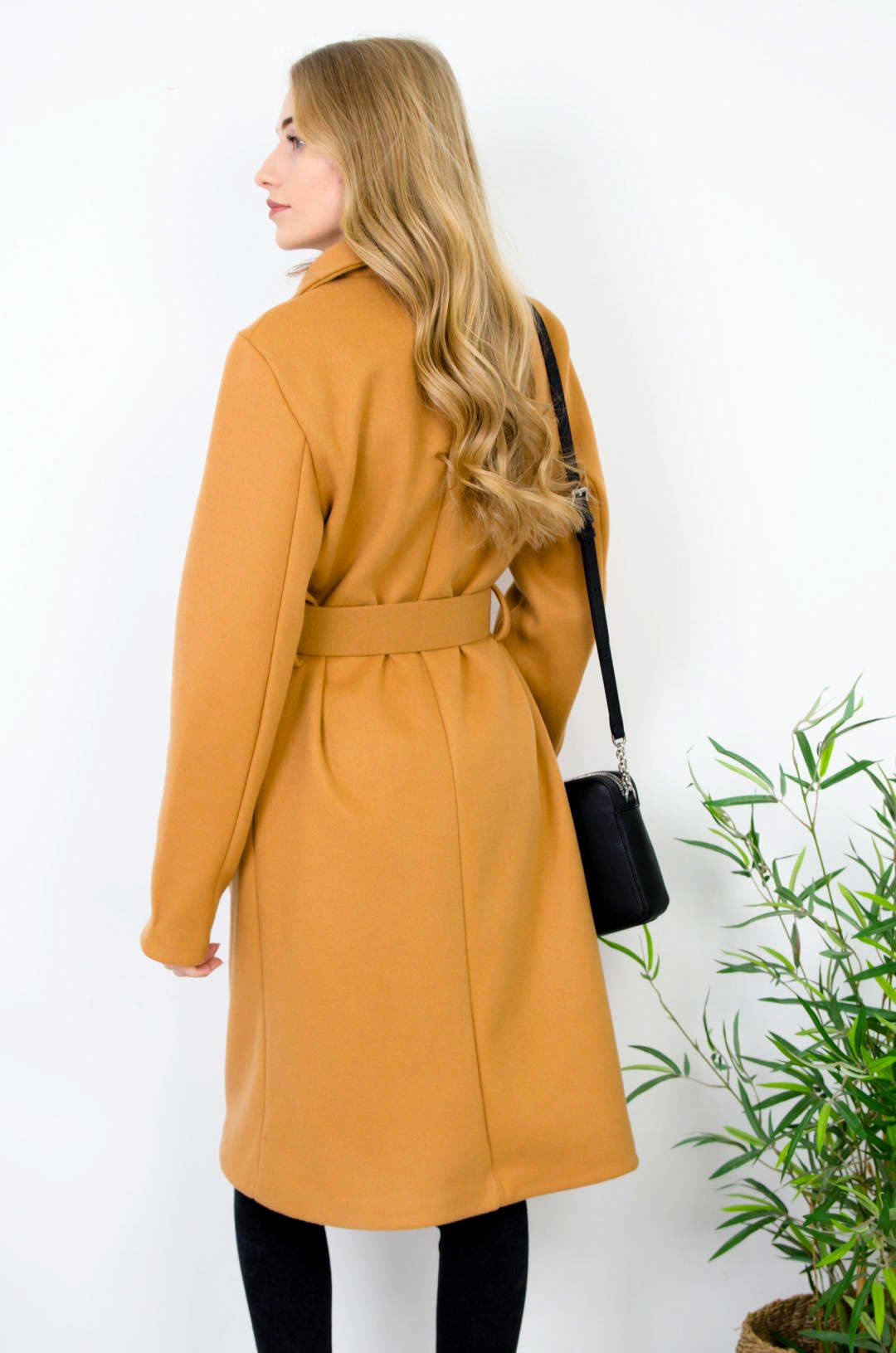 DŁUGI BRĄZOWY TALIOWANY PŁASZCZ