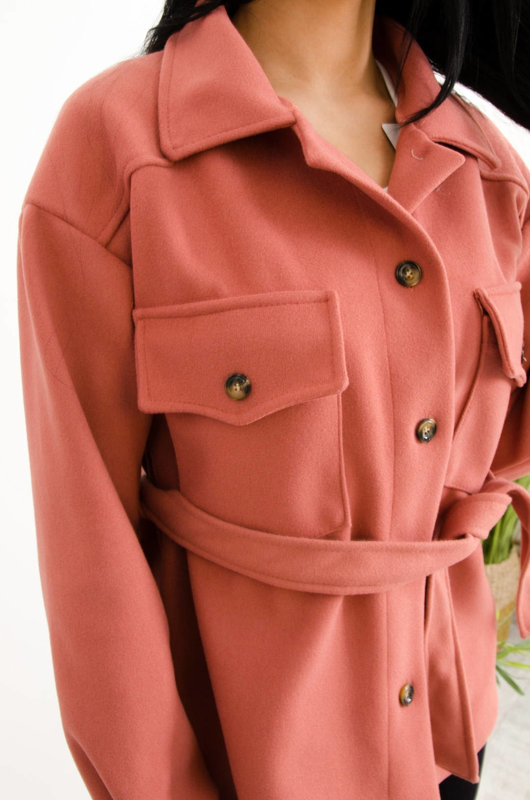 RÓŻOWY KRÓTKI PŁASZCZ WIĄZANY W PASIE