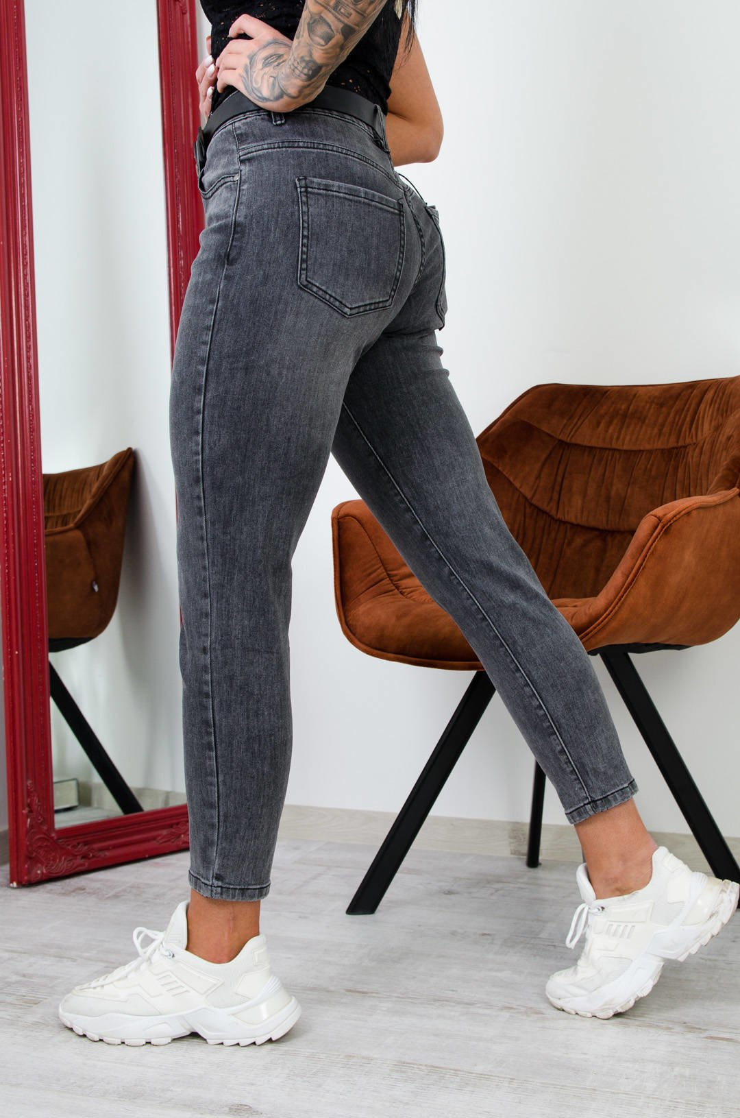 CIEMNO SZARE SPODNIE JEANSOWE Z PASKIEM W ZESTAWIE-WYSOKI STAN