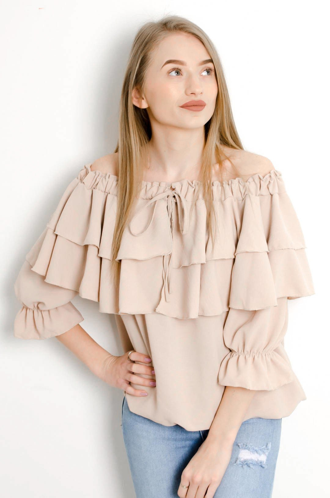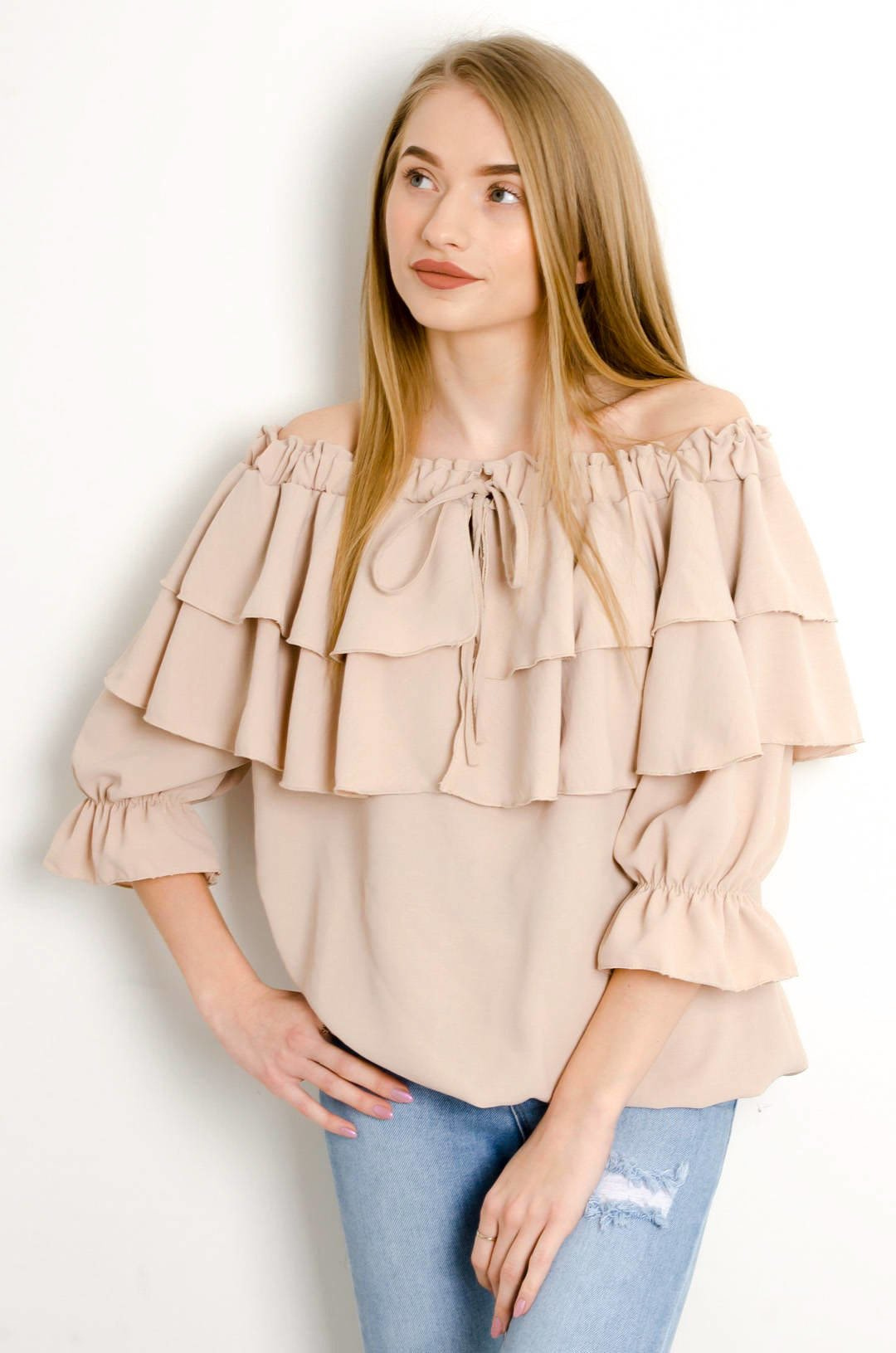 BEŻOWA BLUZKA HISZPANKA Z WIĄZANIEM W DEKOLCIE