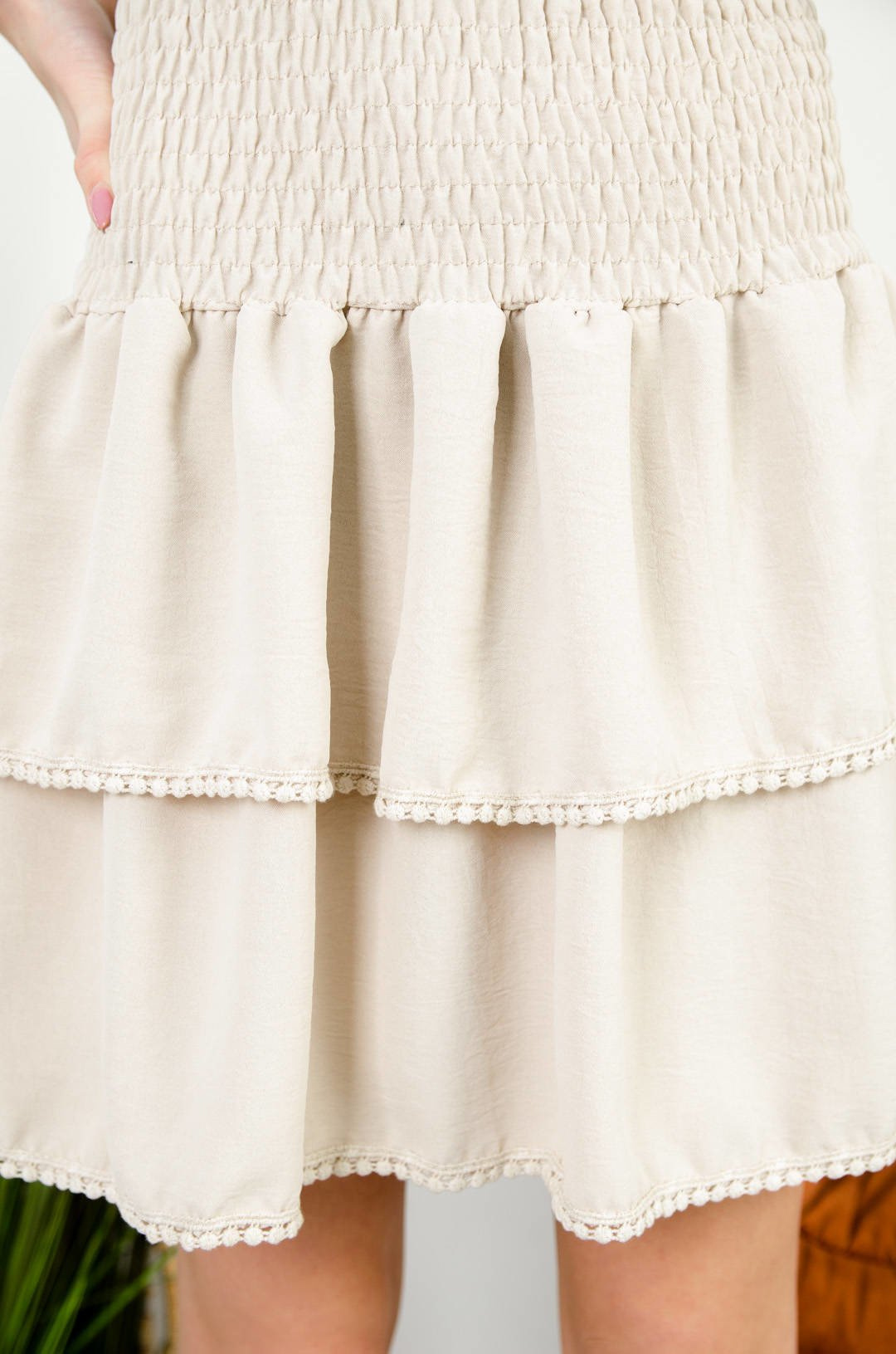 BEŻOWA SUKIENKA Z FALBANAMI I SZEROKIM ŚCIĄGACZEM W PASIE