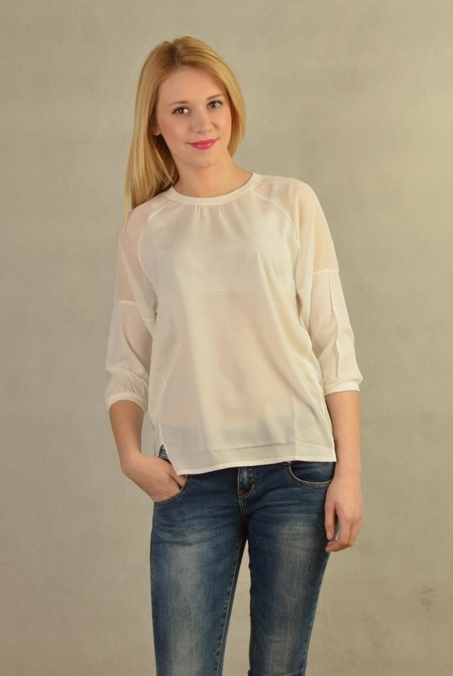 Bluzka gładka z rękawkiem o długości 3/4, posiada ściągacze przy rękawach, oraz dekolcie, z tyłu zapinana na zamek.