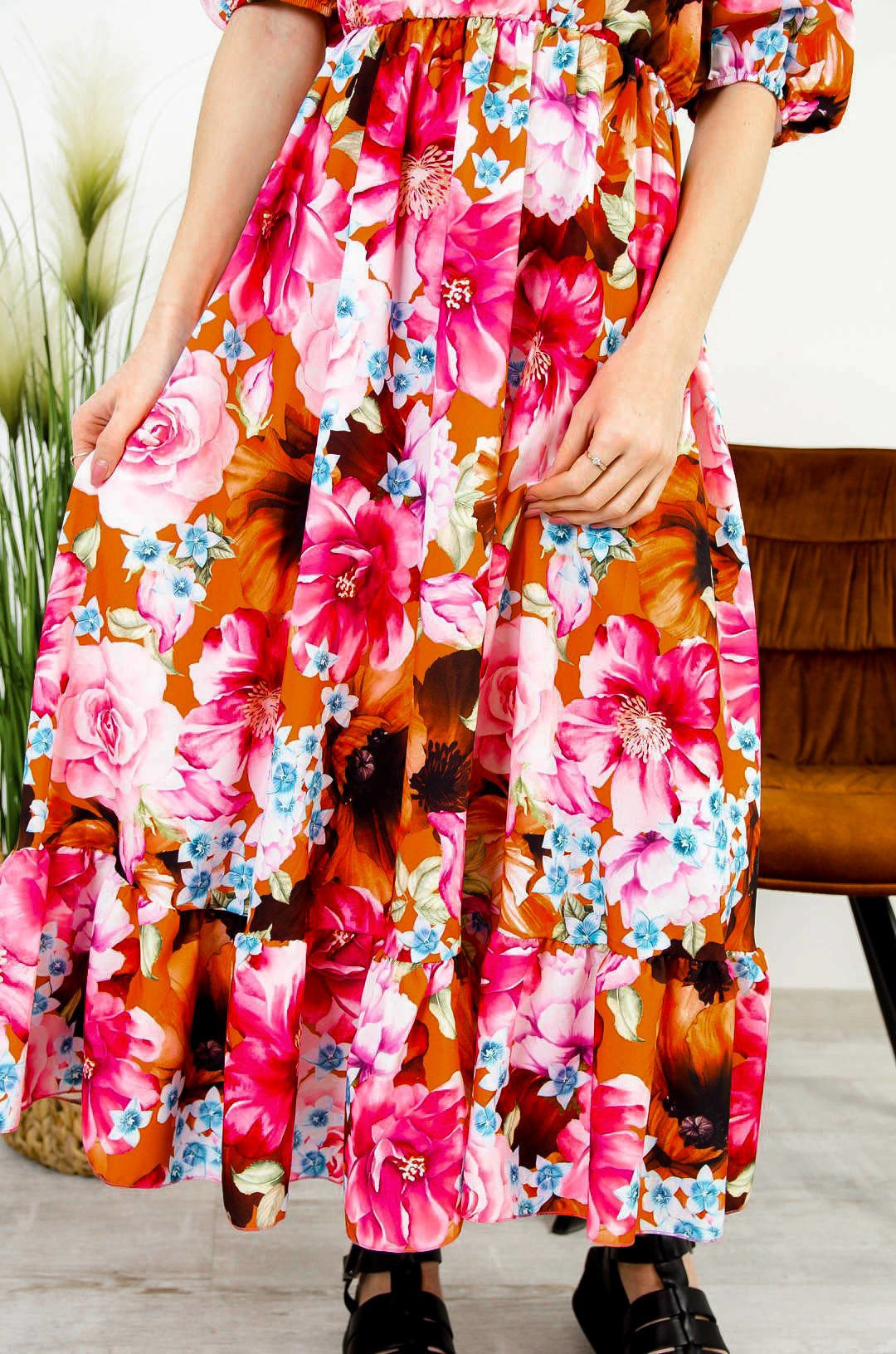 DŁUGA KOLOROWA SUKIENKA Z BUFIASTYMI RĘKAWAMI
