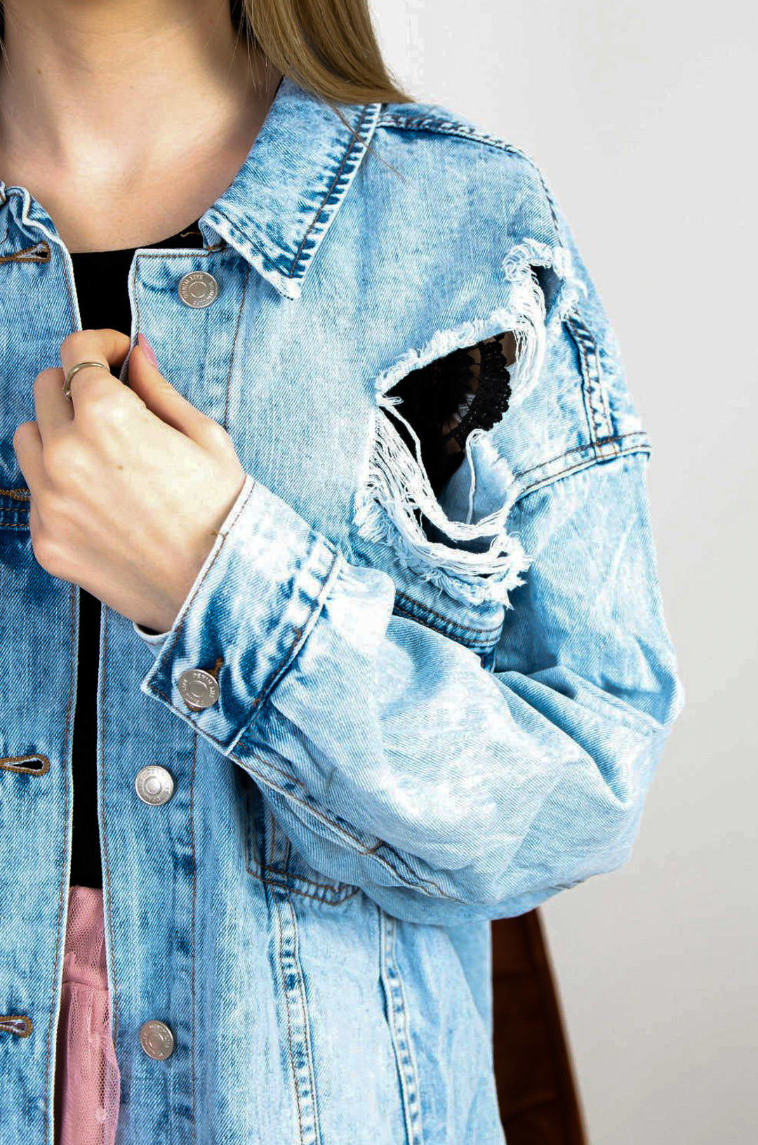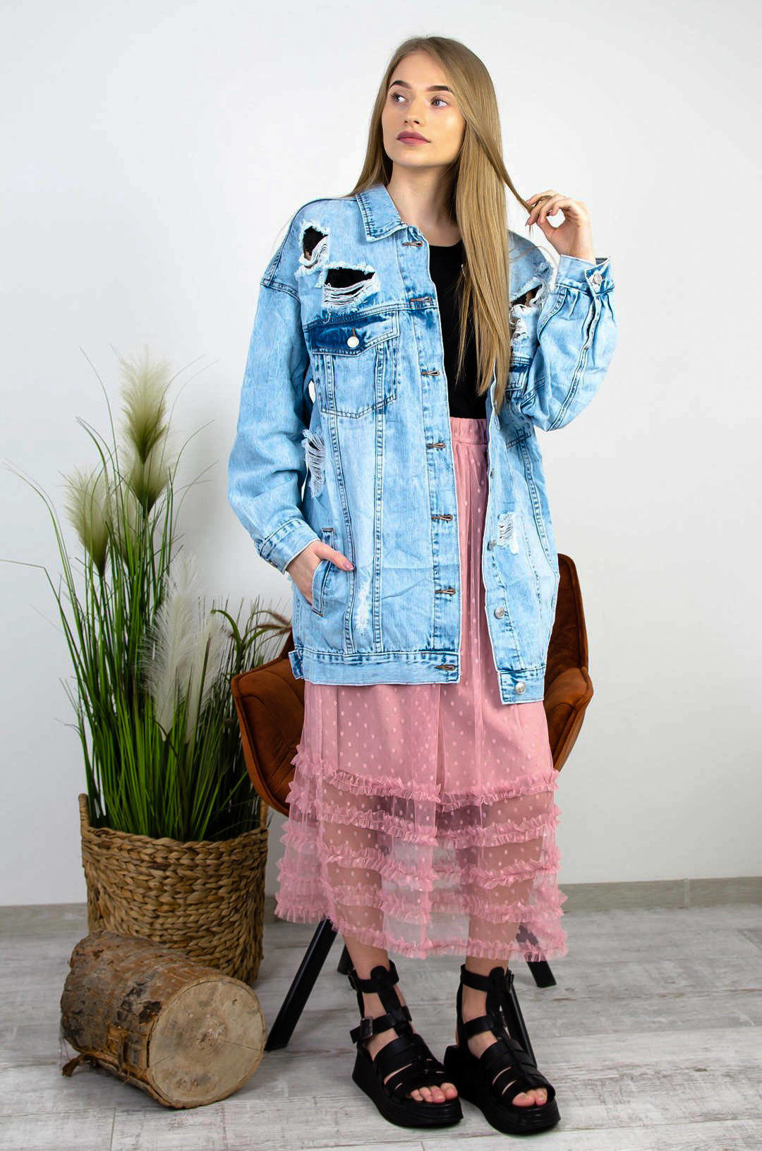 DŁUGA KURTKA JEANSOWA Z PRZETARCIAMI  ( DUŻE ROZMIARY M-3XL )