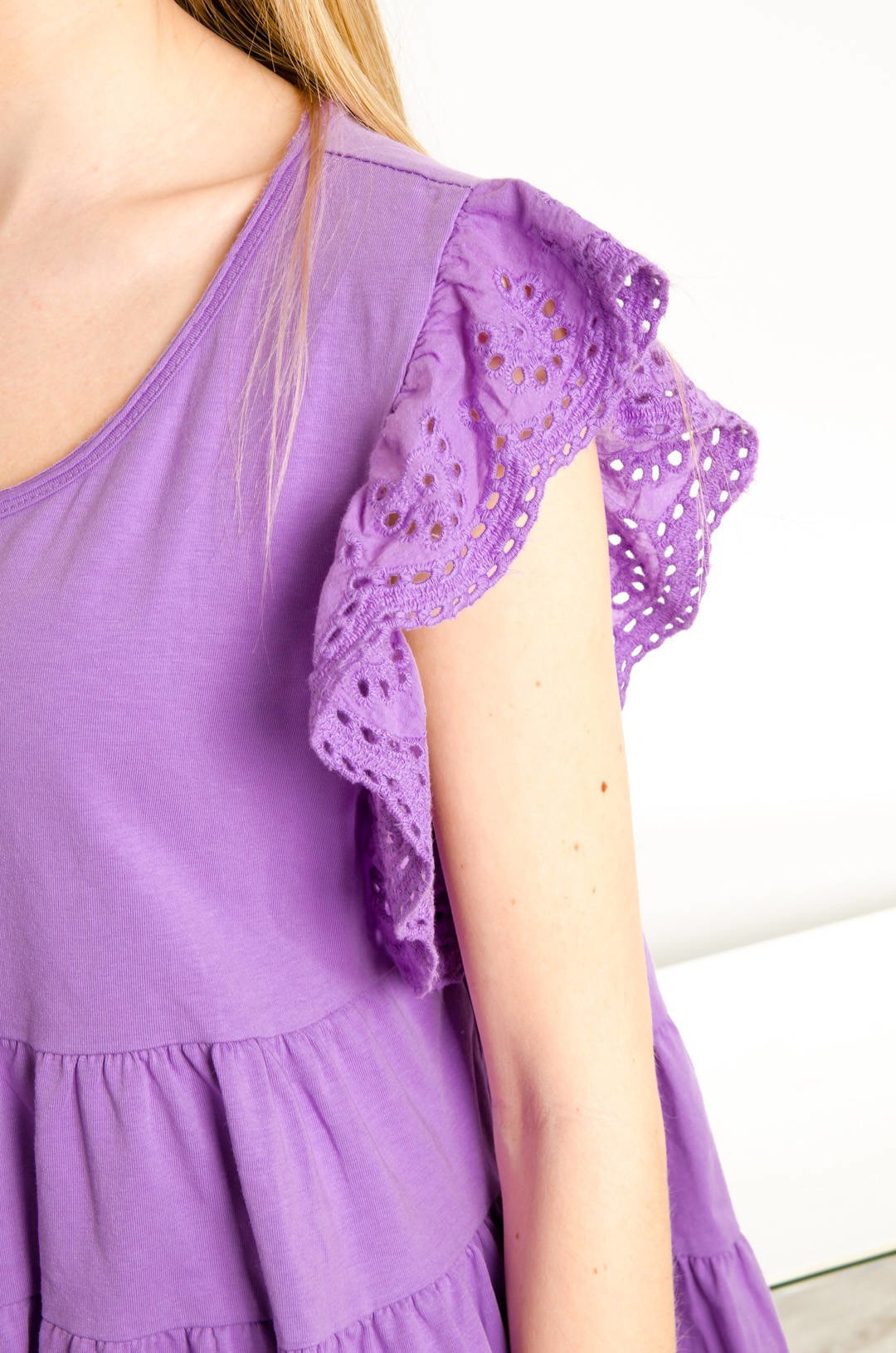 FIOLETOWA ROZKLOSZOWANA BLUZKA Z AŻUROWYMI RĘKAWAMI