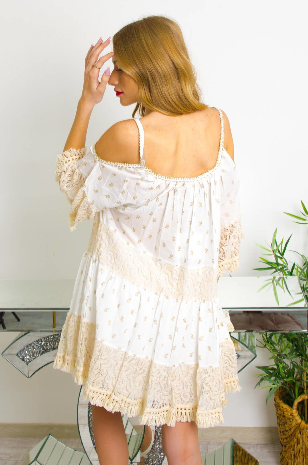 BIAŁO-BEŻOWA TUNIKA W STYLU BOHO ZE ZŁOTYM ZDOBIENIEM