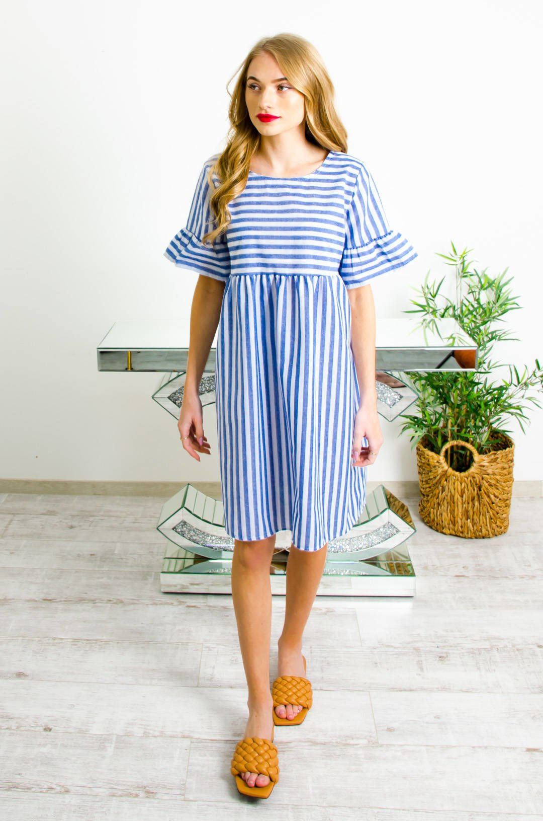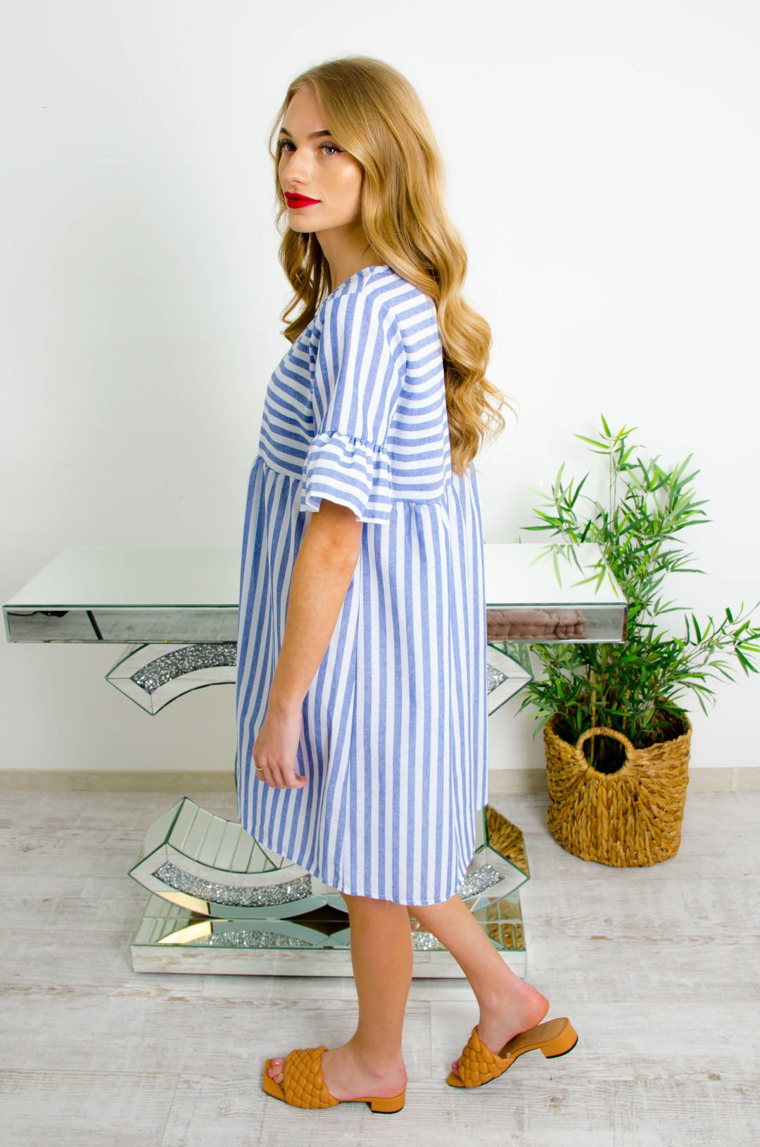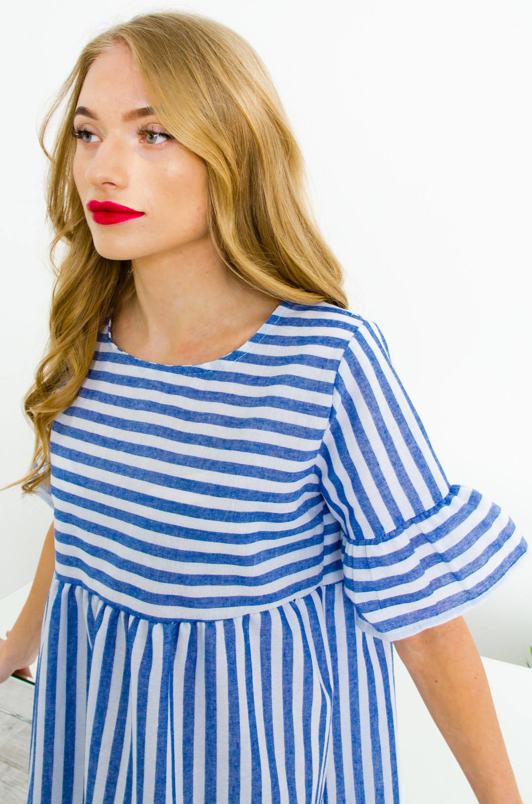 BIAŁO-NIEBIESKA SUKIENKA W PASKI O LUŻNYM KROJU