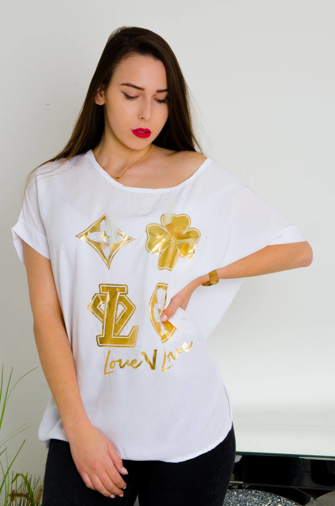 BIAŁA BLUZKA ZE ZŁOTĄ APLIKACJĄ I NAPISAMI