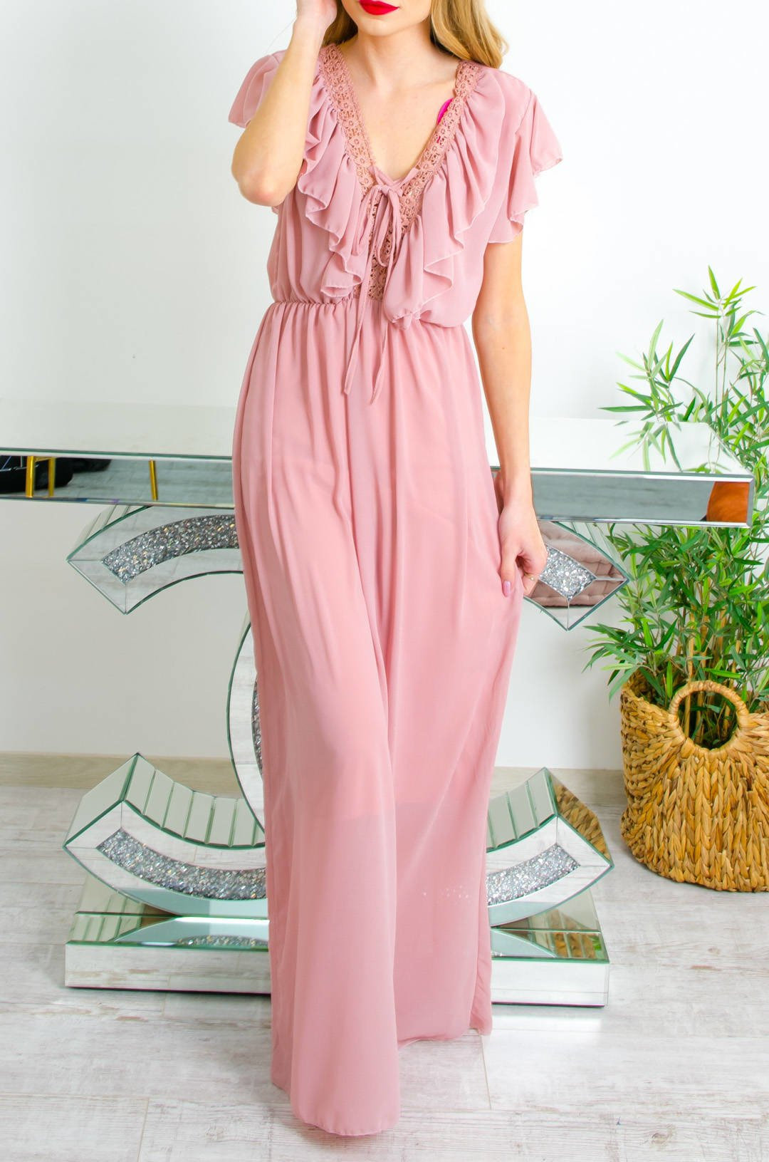 DŁUGA ELEGANCKA SUKIENKA MAXI Z ŻABOTEM - BRUDNY RÓŻ