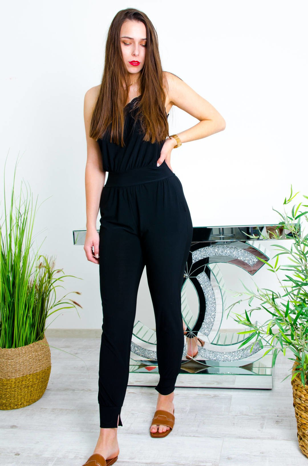 CZARNY DŁUGI KOMBINEZON NA CIENKICH RAMIĄCZKACH