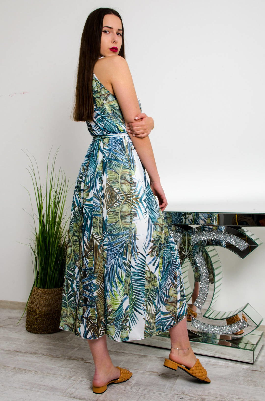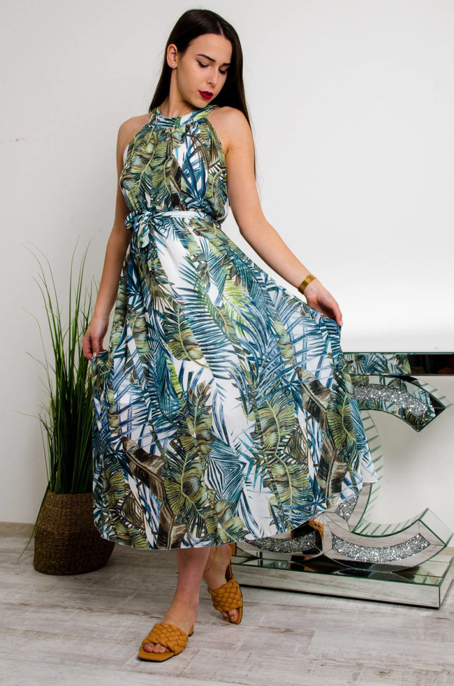 DŁUGA BIAŁO-ZIELONA SUKIENKA MAXI W KWIATOWY WZÓR