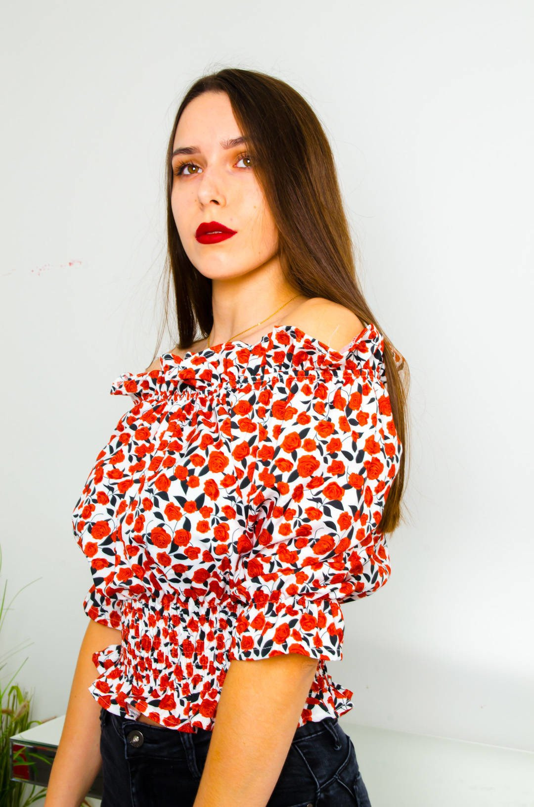 BIAŁA BLUZKA HISZPANKA W CZERWONE KWIATY