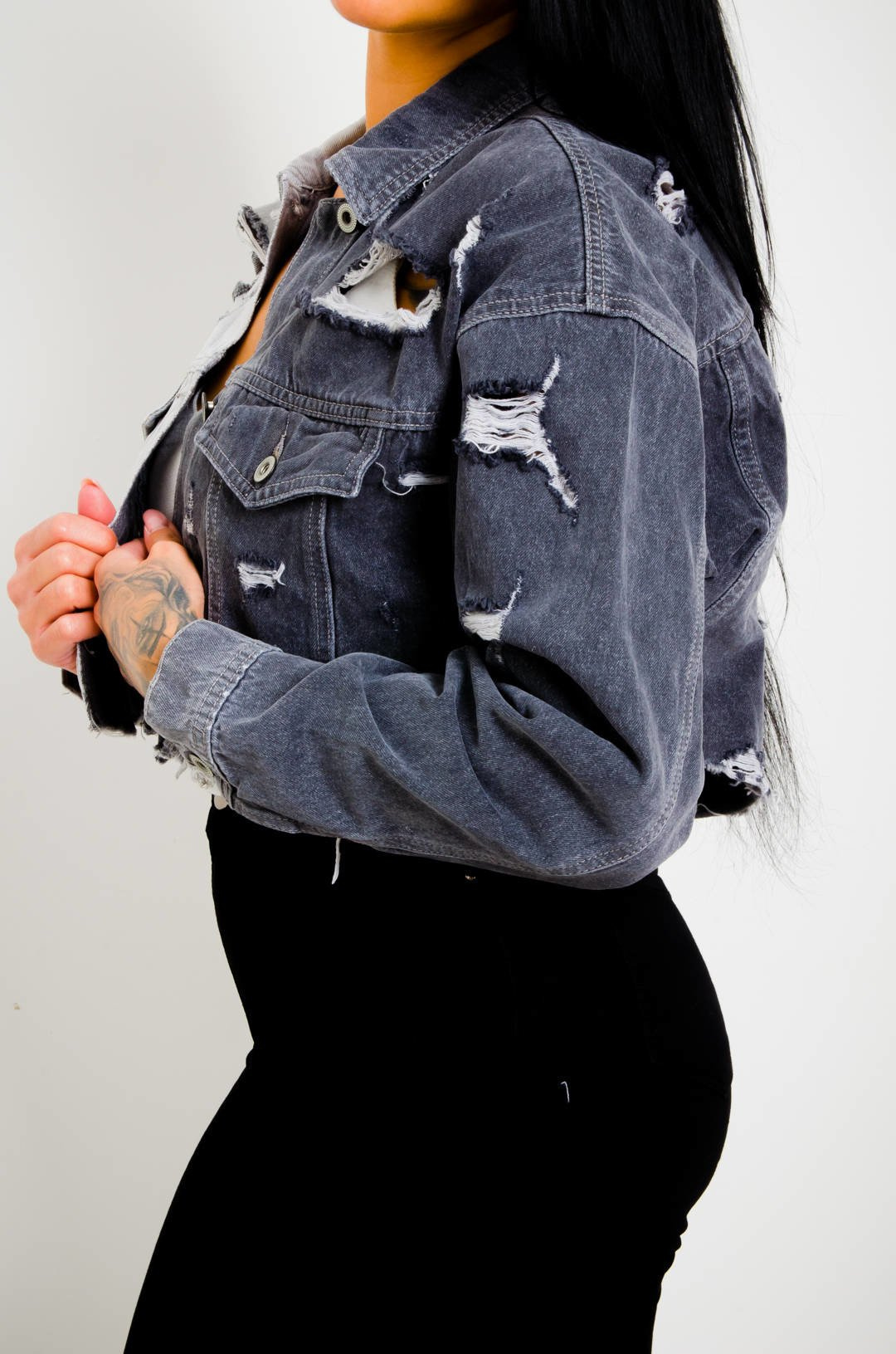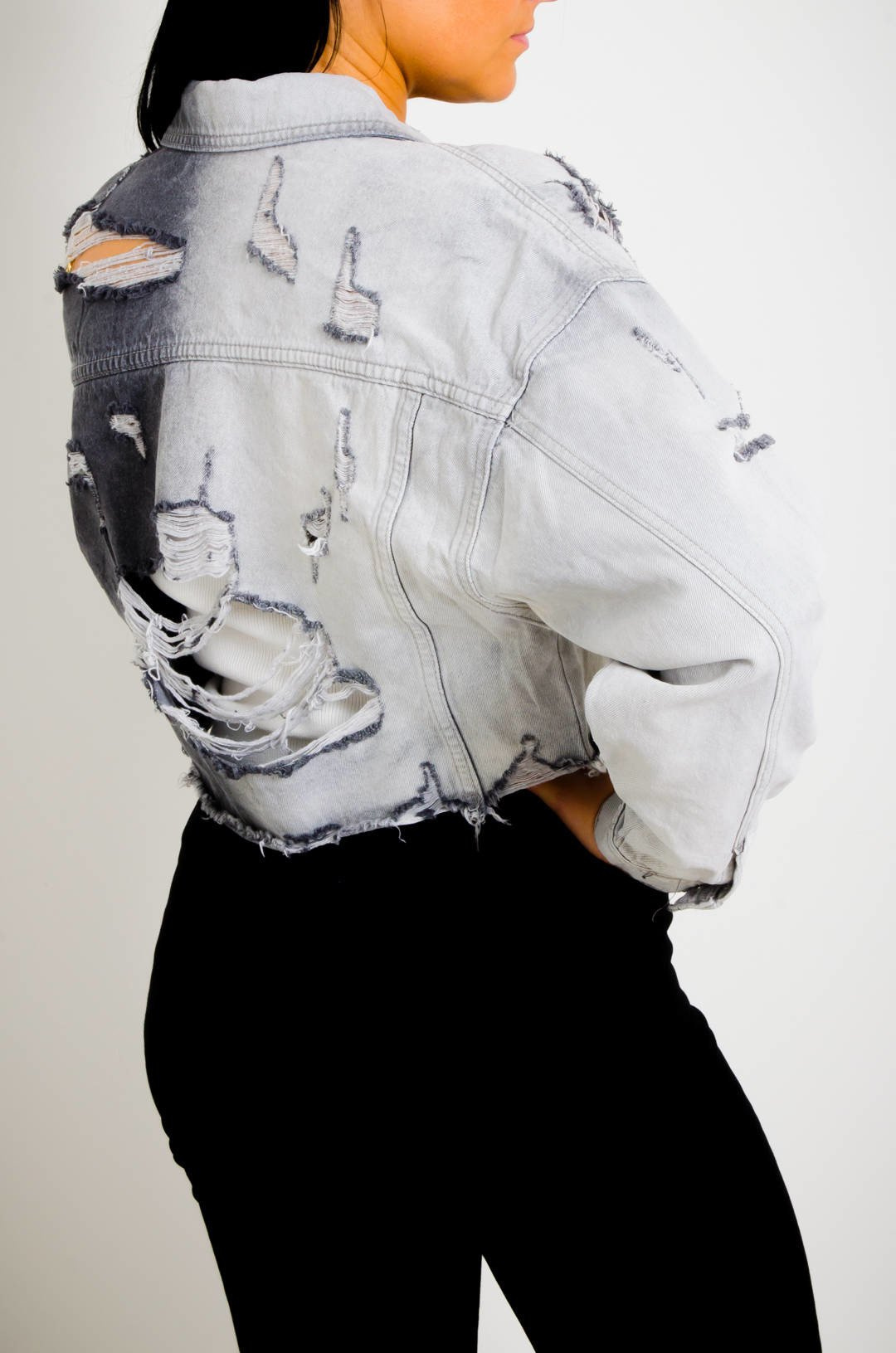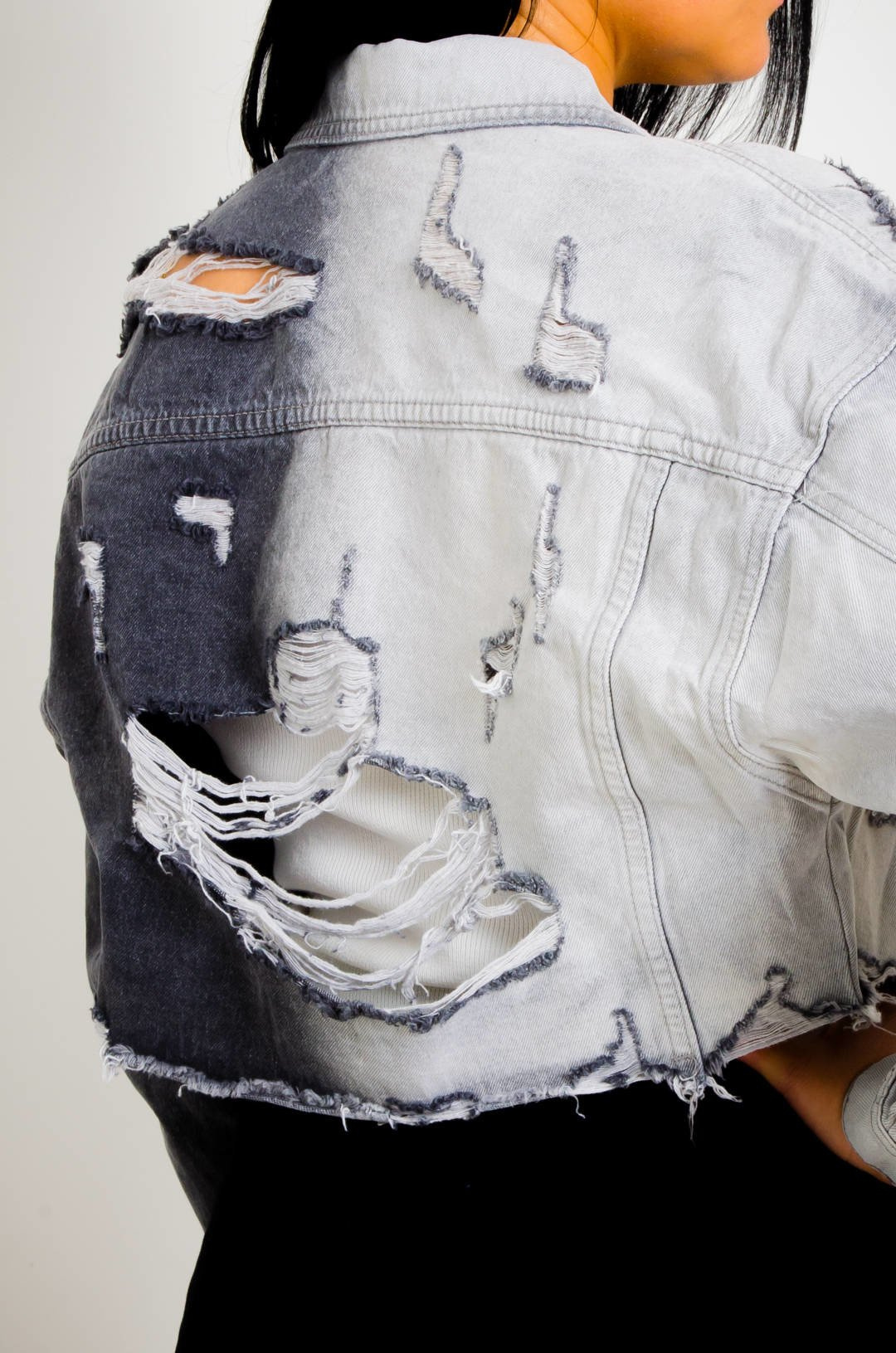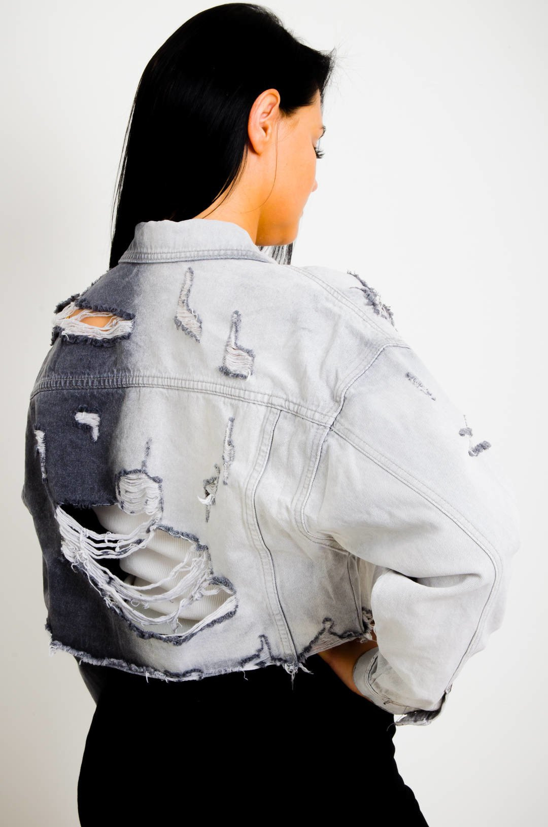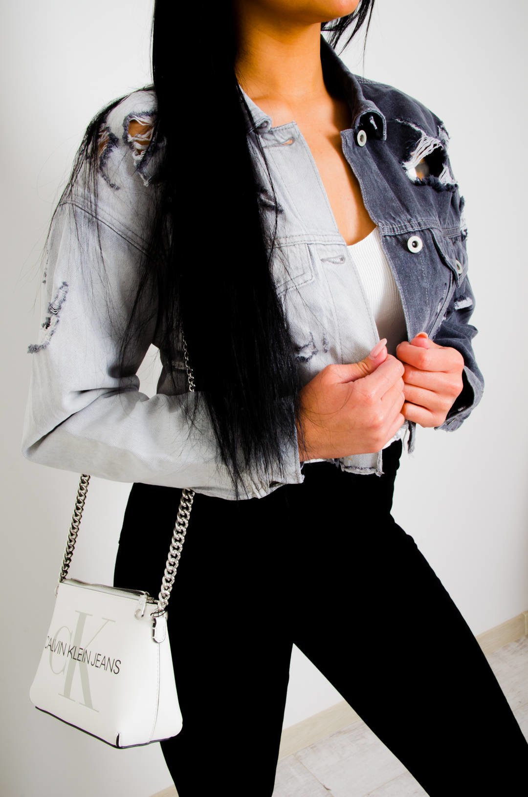 KURTKA JEANSOWA DWUKOLOROWA SZARA Z DZIURAMI