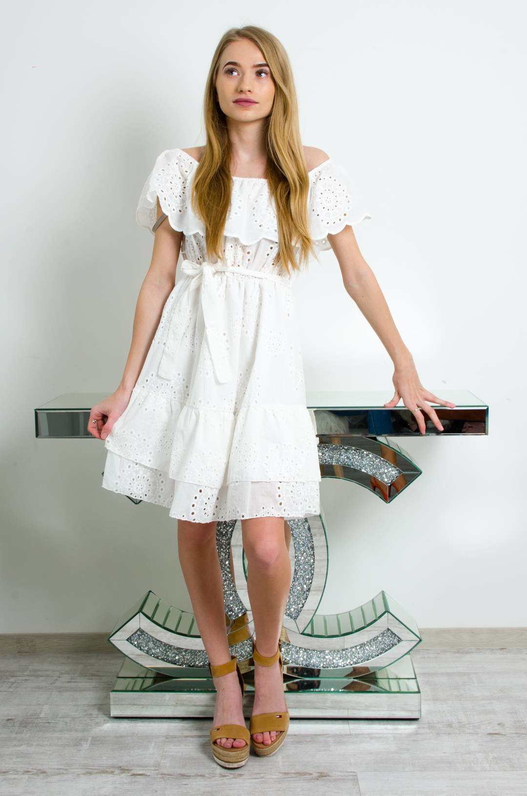 BIAŁA AŻUROWA SUKIENKA HISZPANKA Z WIĄZANIEM W PASIE